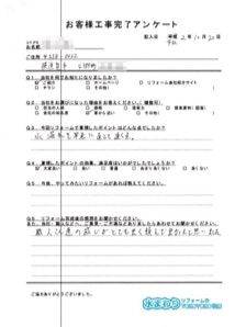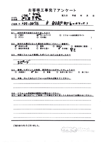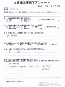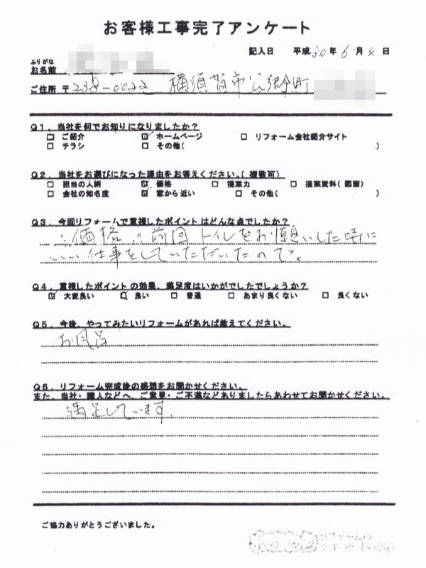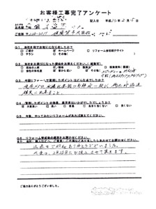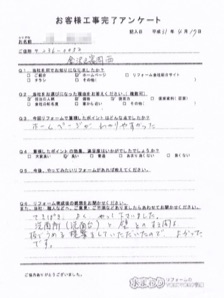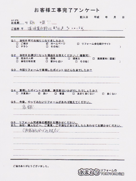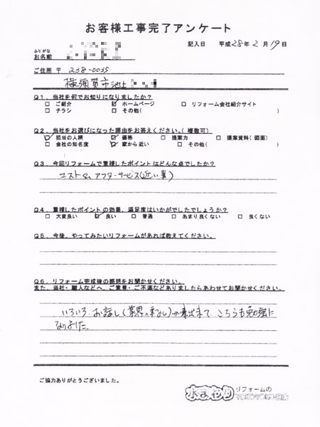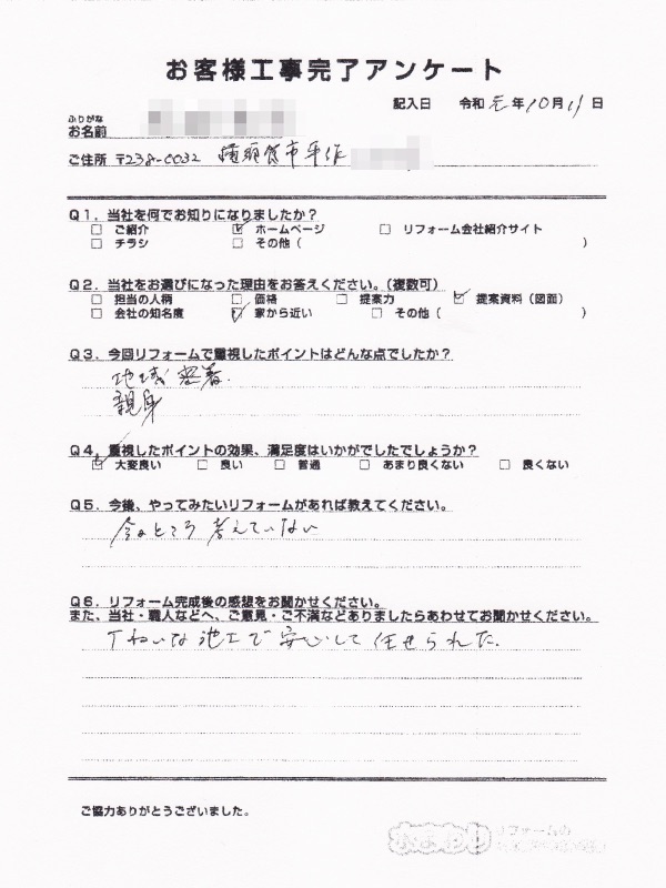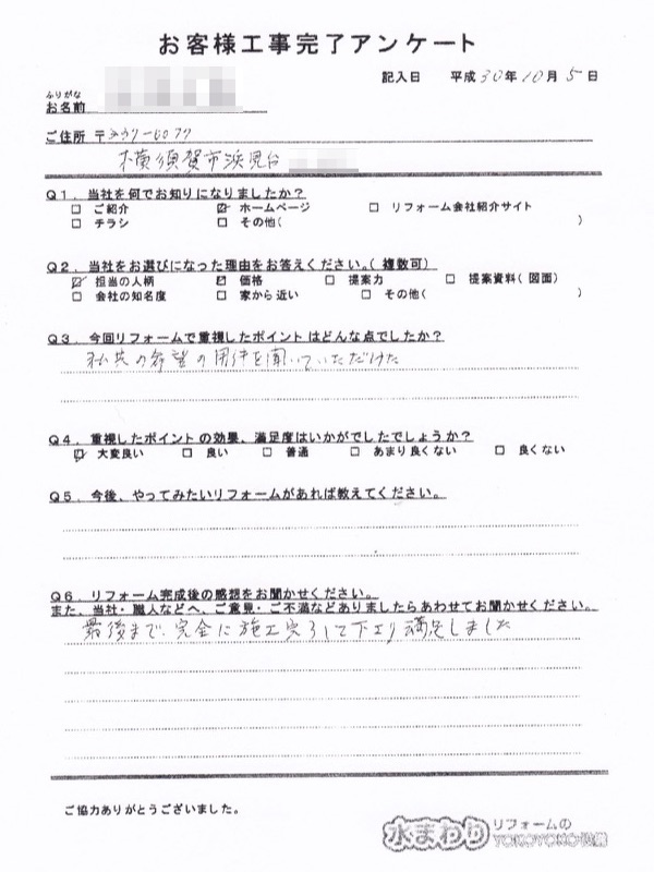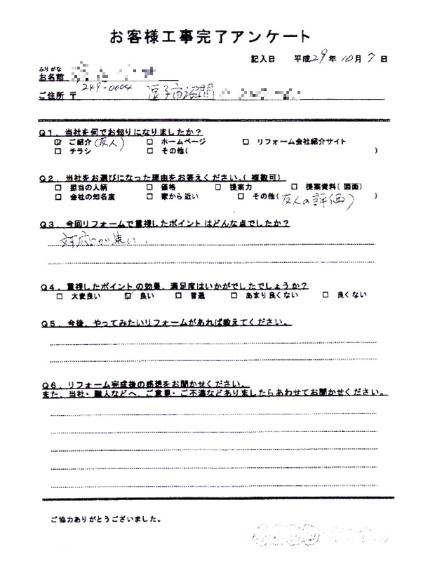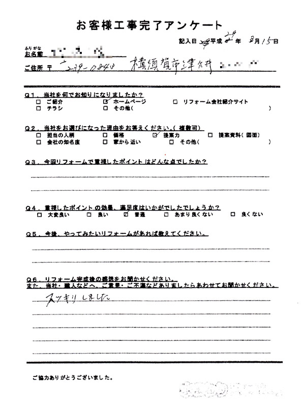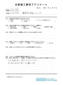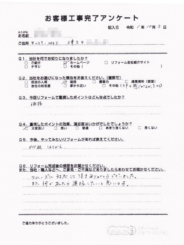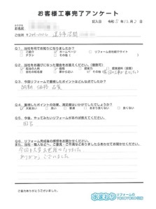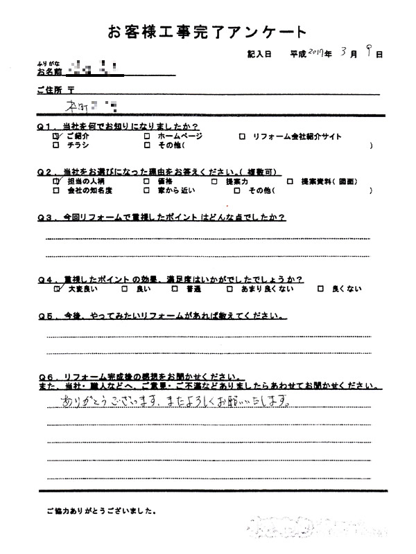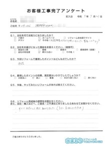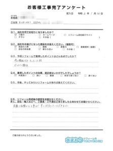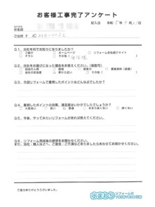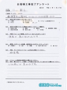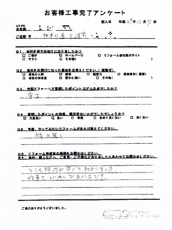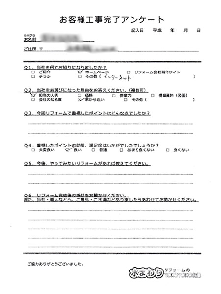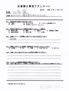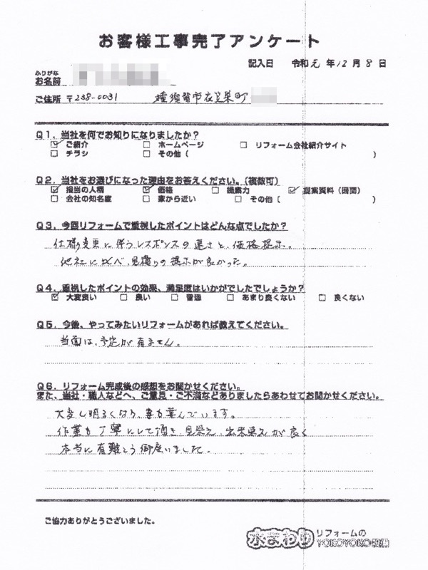 お客様に満足していただける住まい作りができるよう、また、私たちが今後もより良いお手伝いができるよう、工事完了後にアンケートをご記入いただいています。