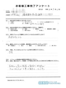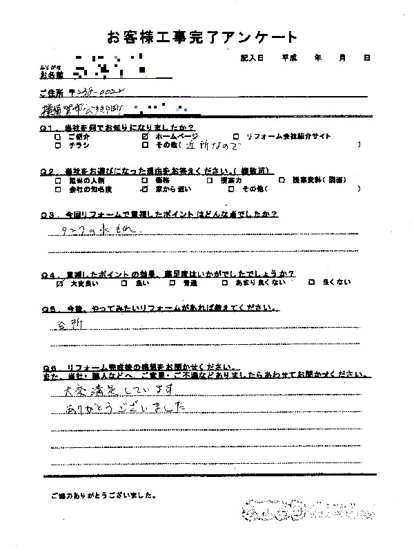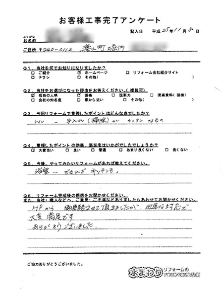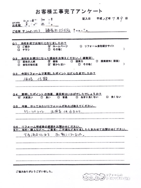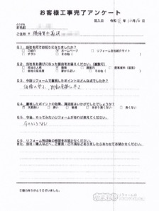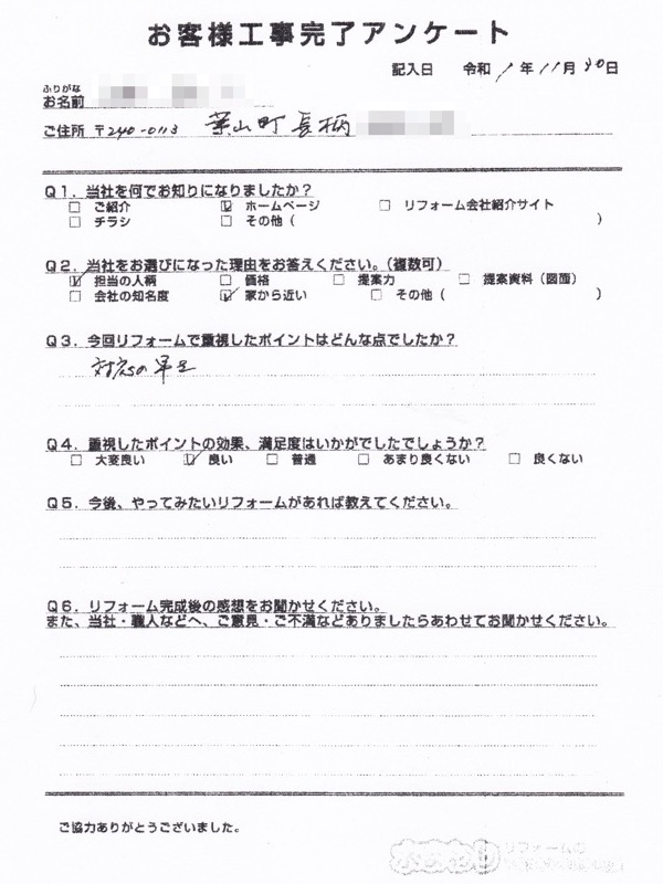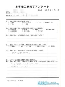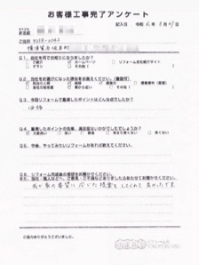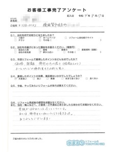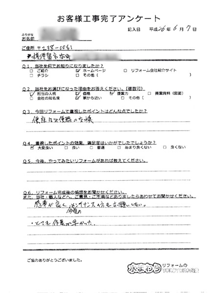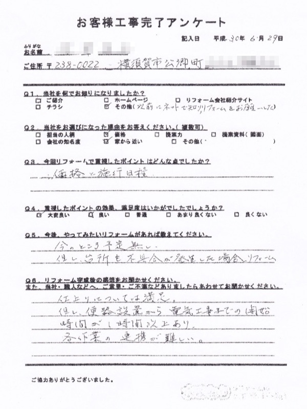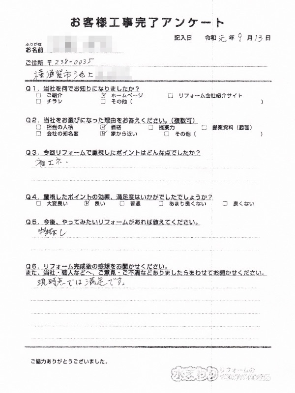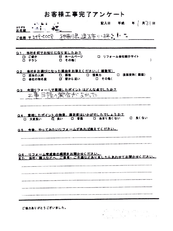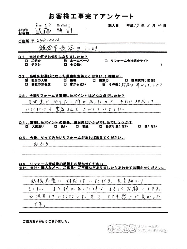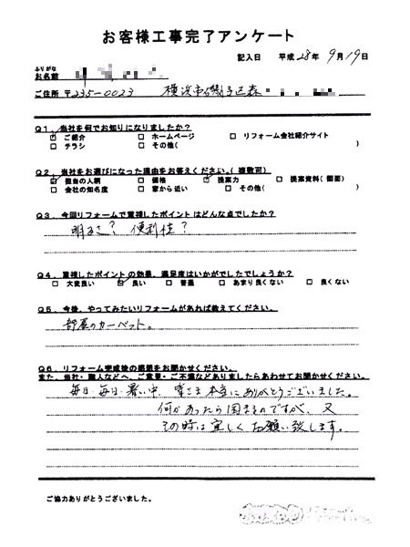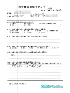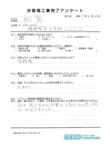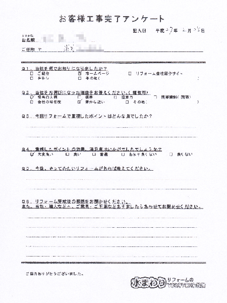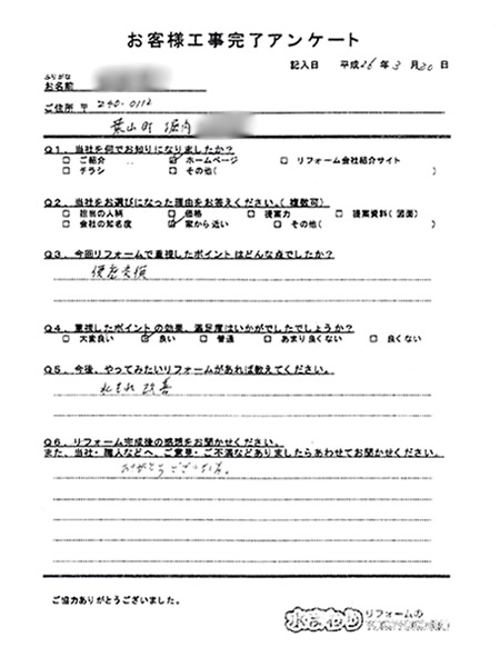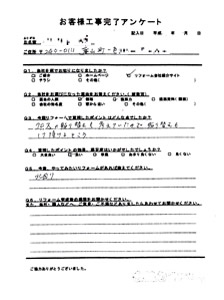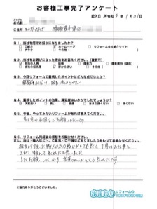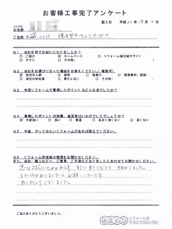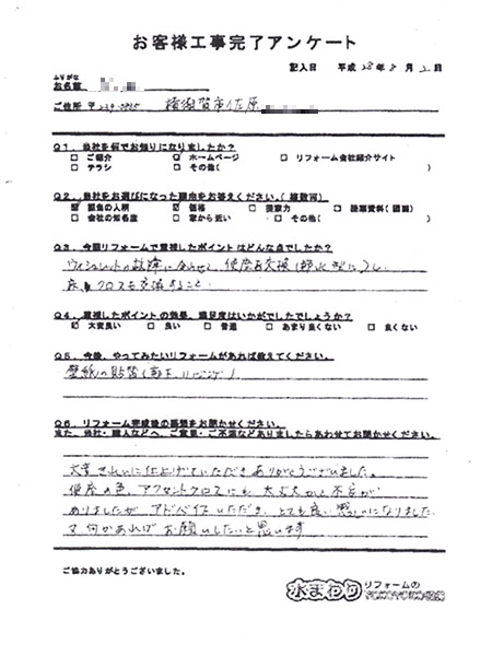 お客様に満足していただける住まい作りができるよう、また、私たちが今後もより良いお手伝いができるよう、工事完了後にアンケートをご記入いただいています。