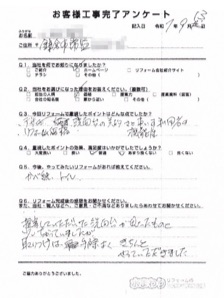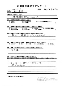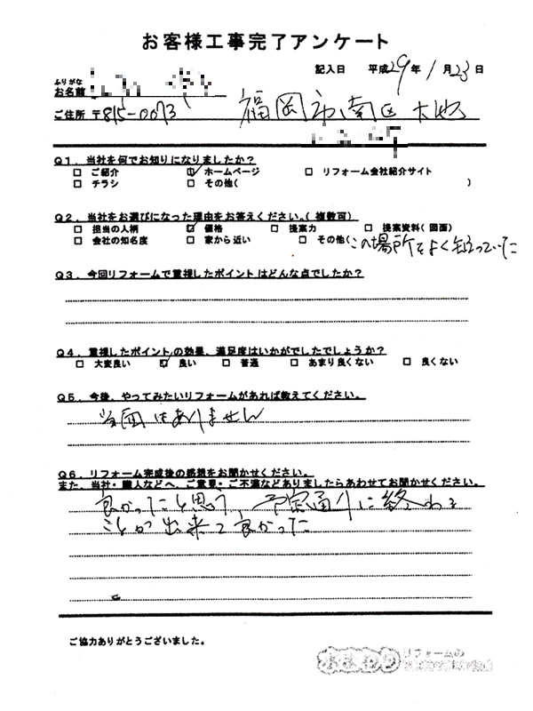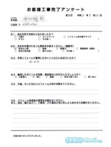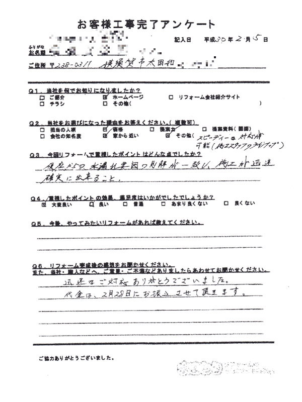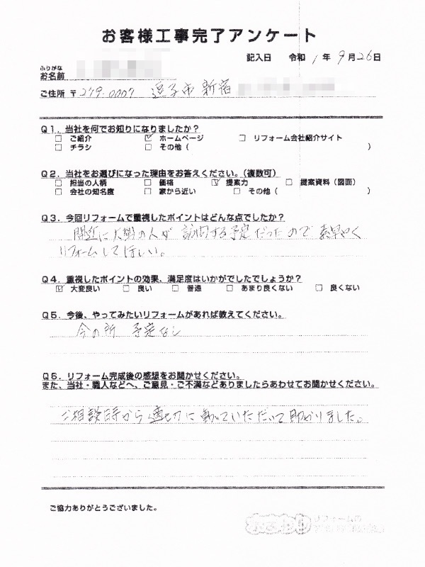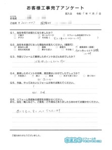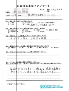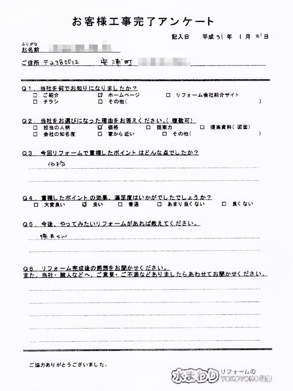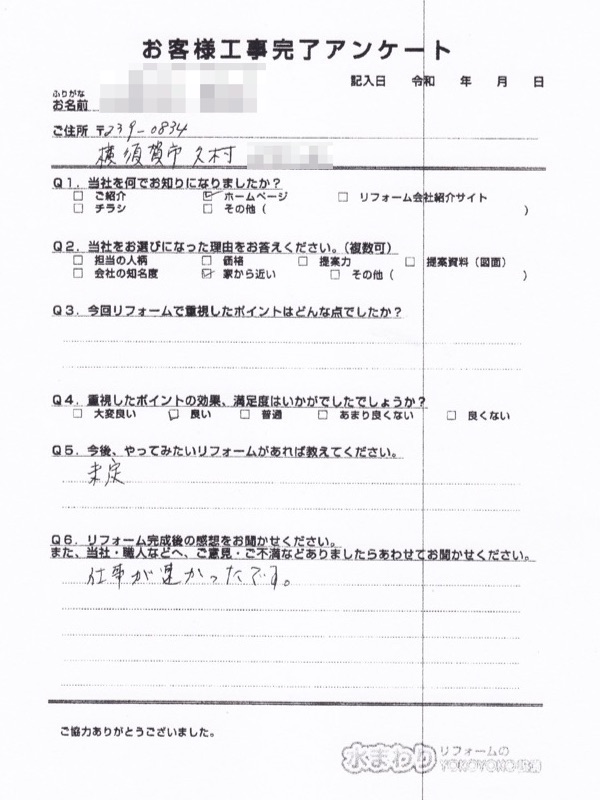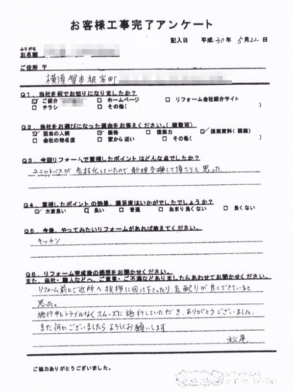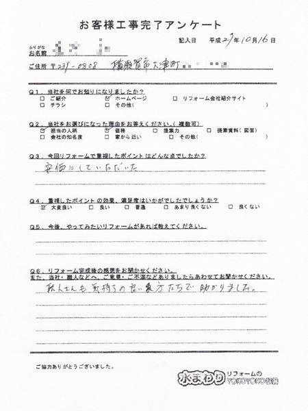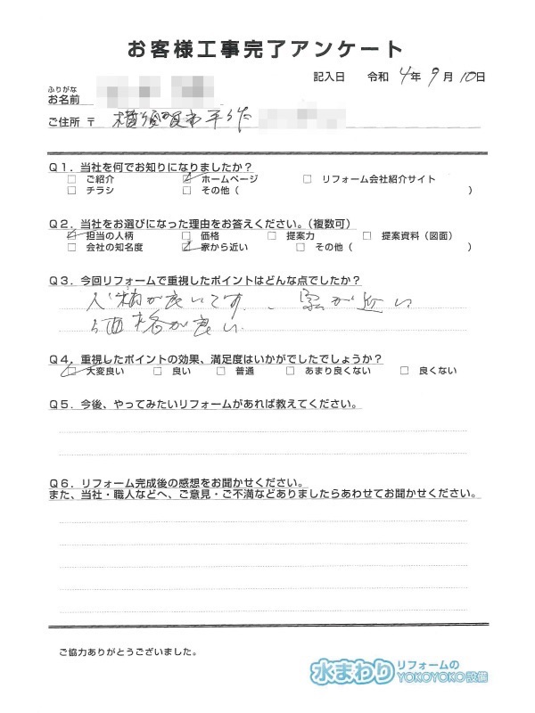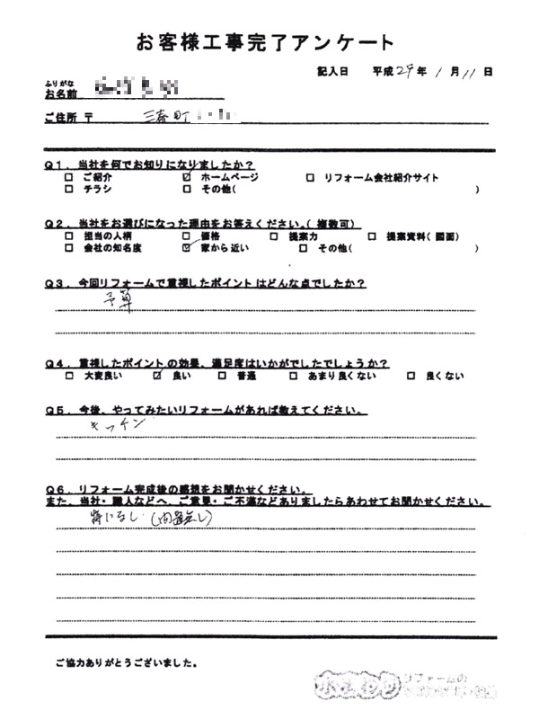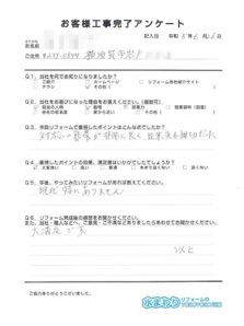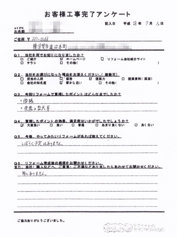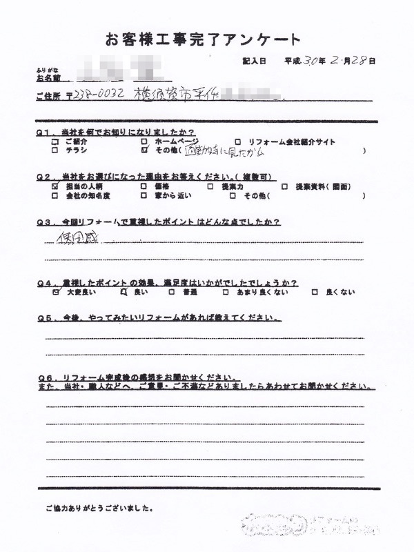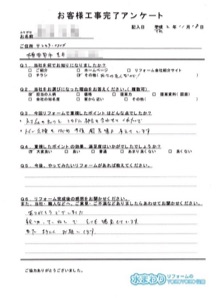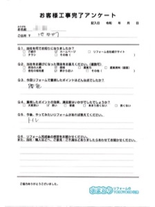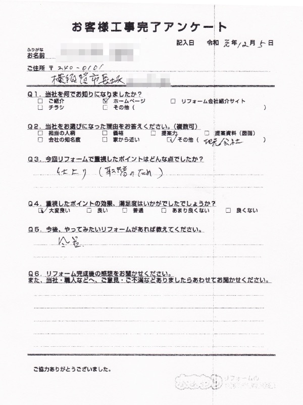 お客様に満足していただける住まい作りができるよう、また、私たちが今後もより良いお手伝いができるよう、工事完了後にアンケートをご記入いただいています。