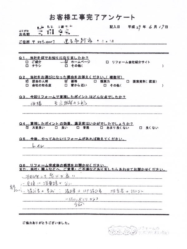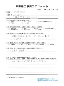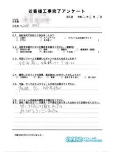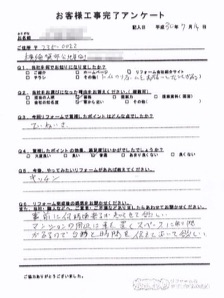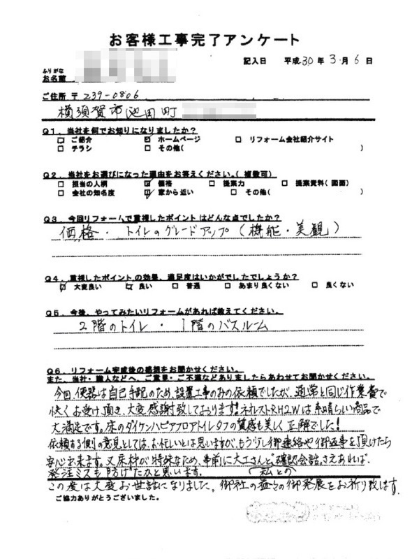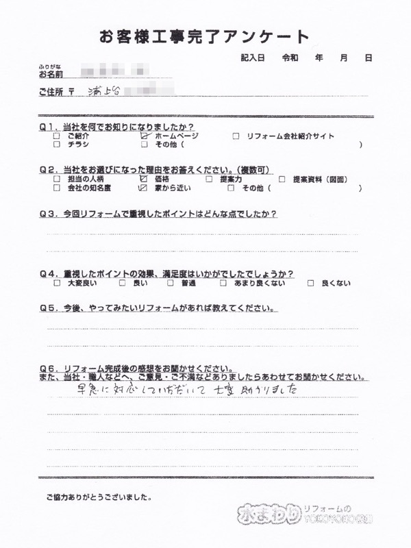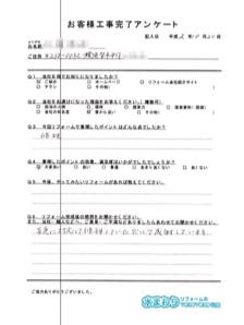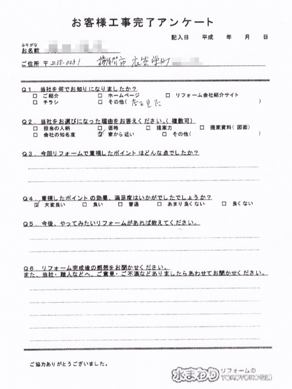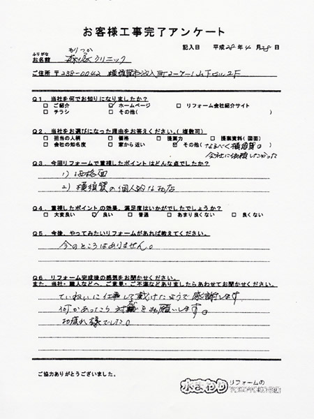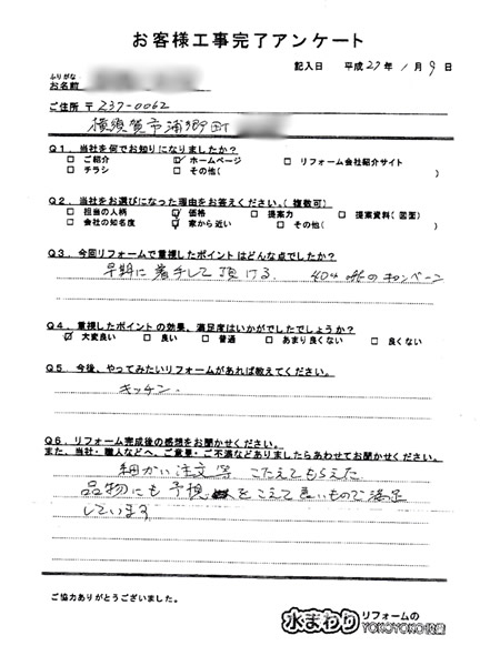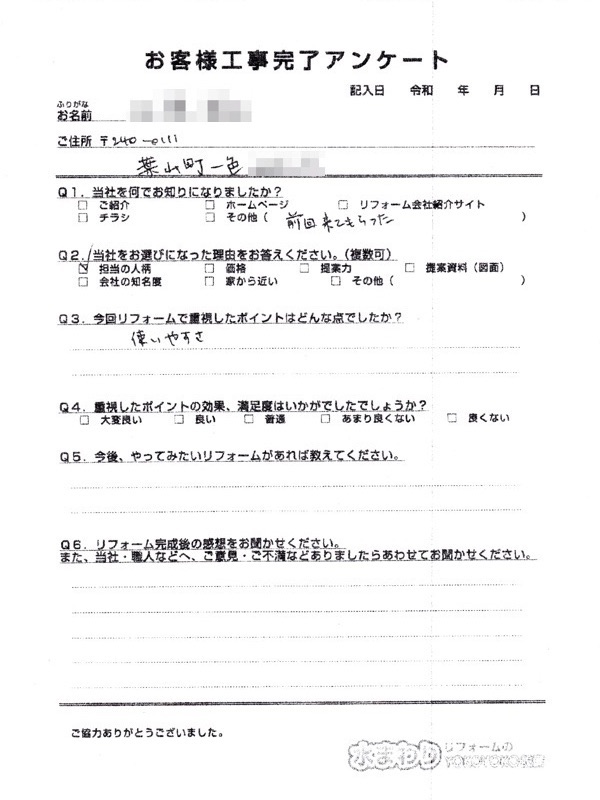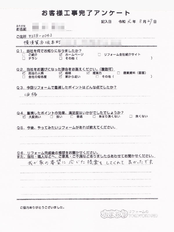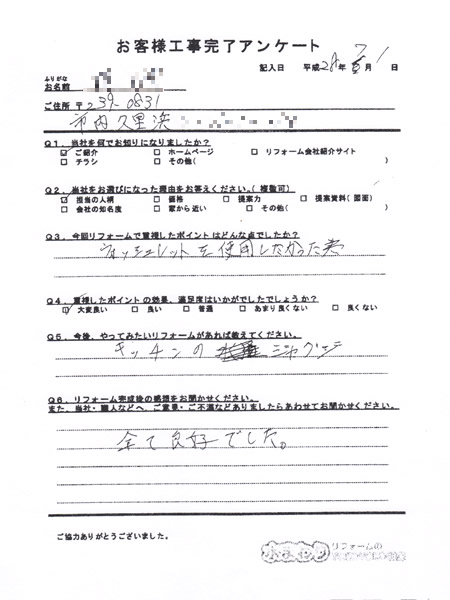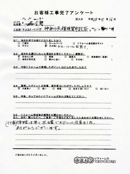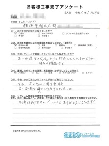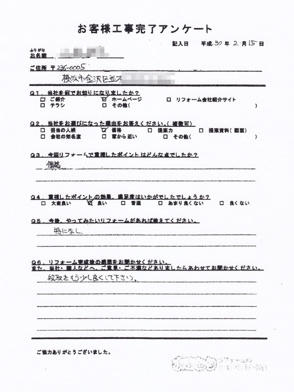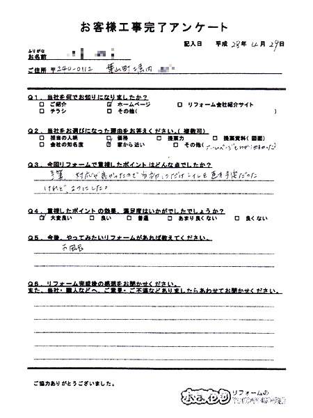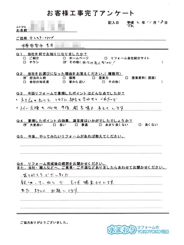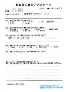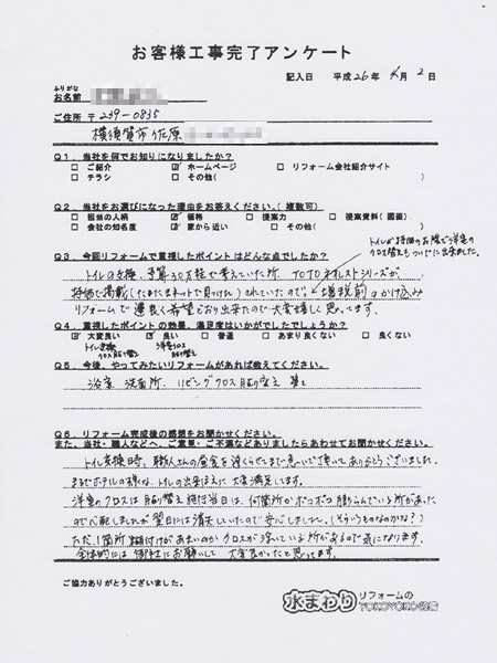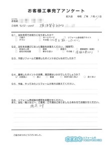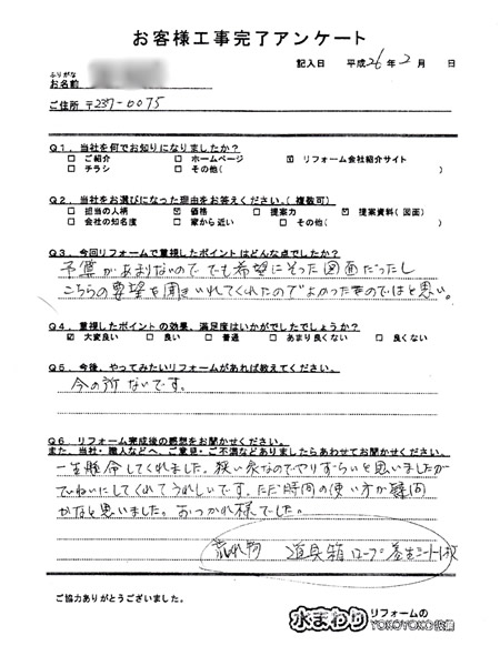 お客様に満足していただける住まい作りができるよう、また、私たちが今後もより良いお手伝いができるよう、工事完了後にアンケートをご記入いただいています。