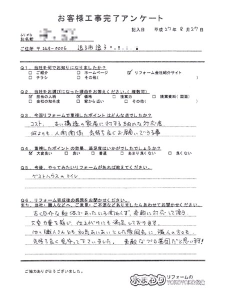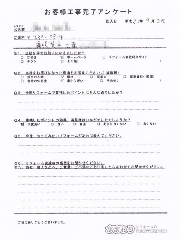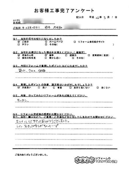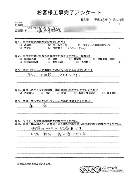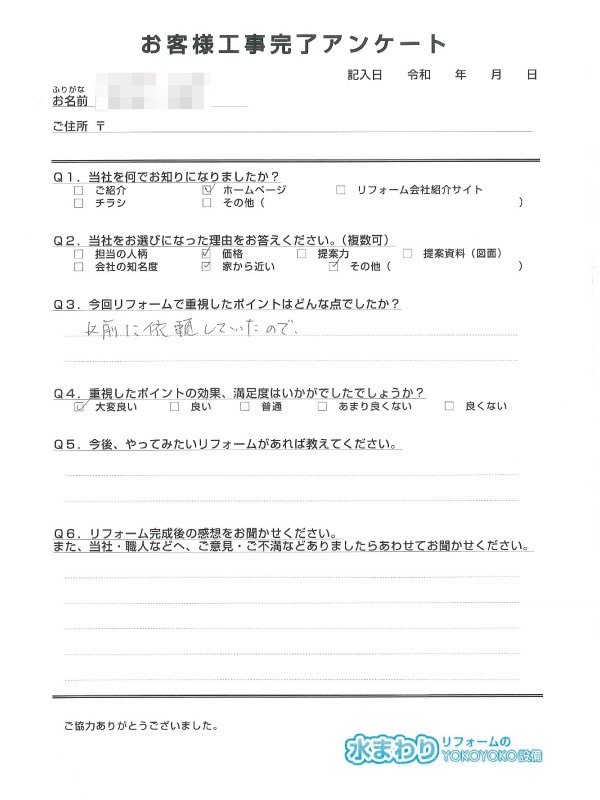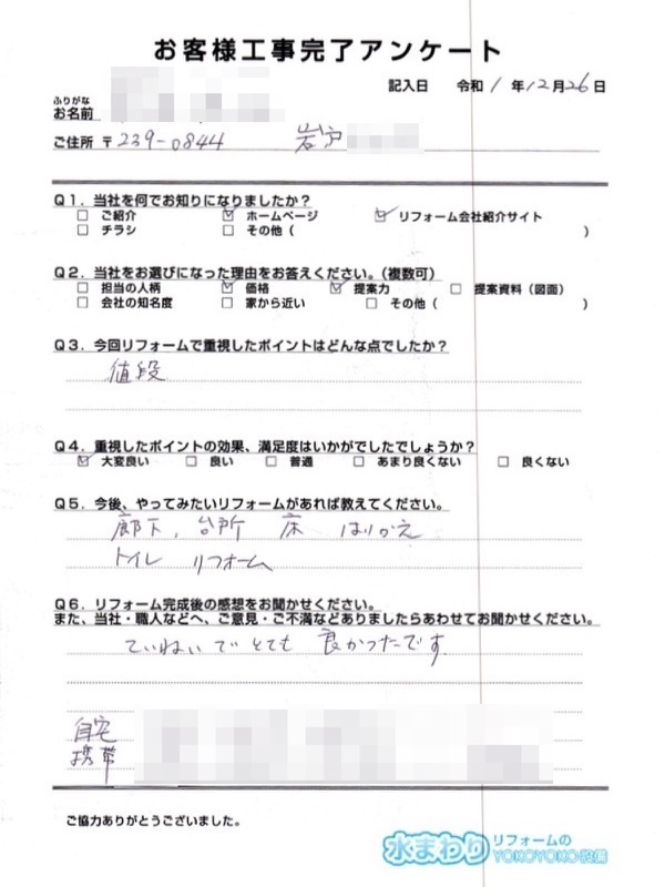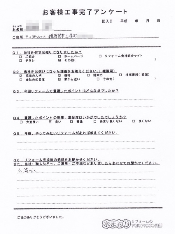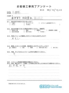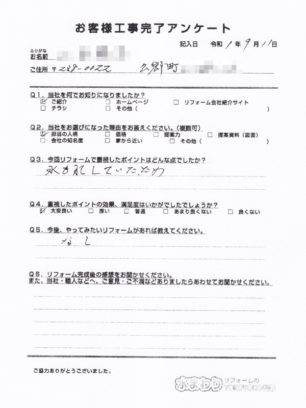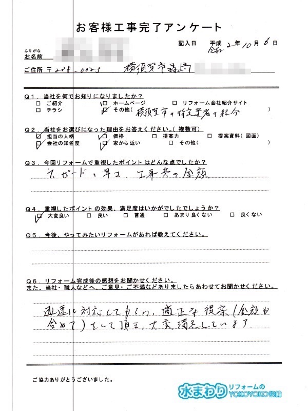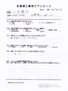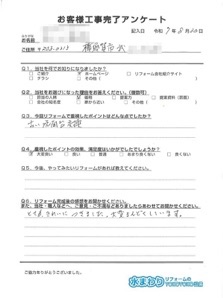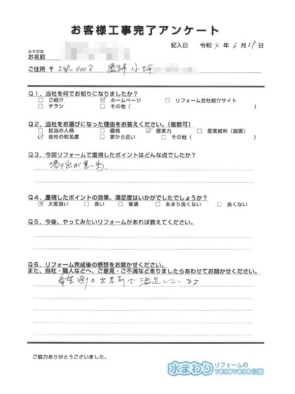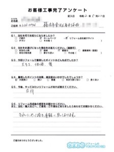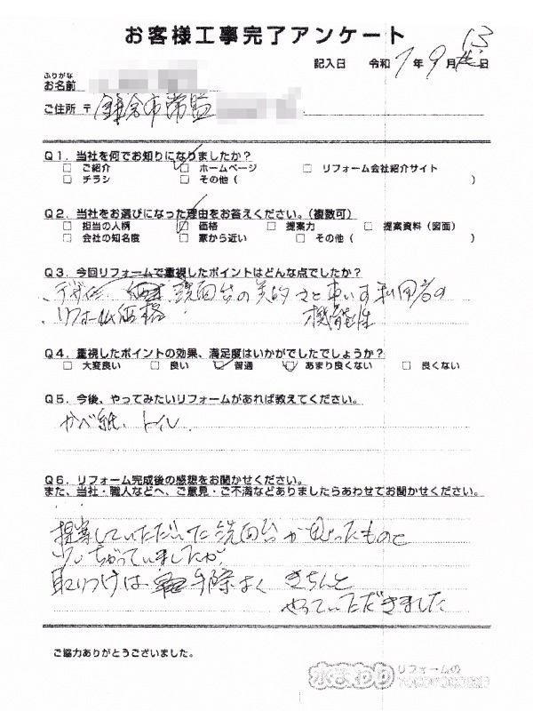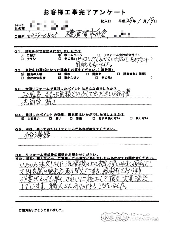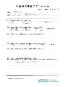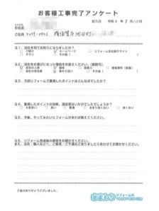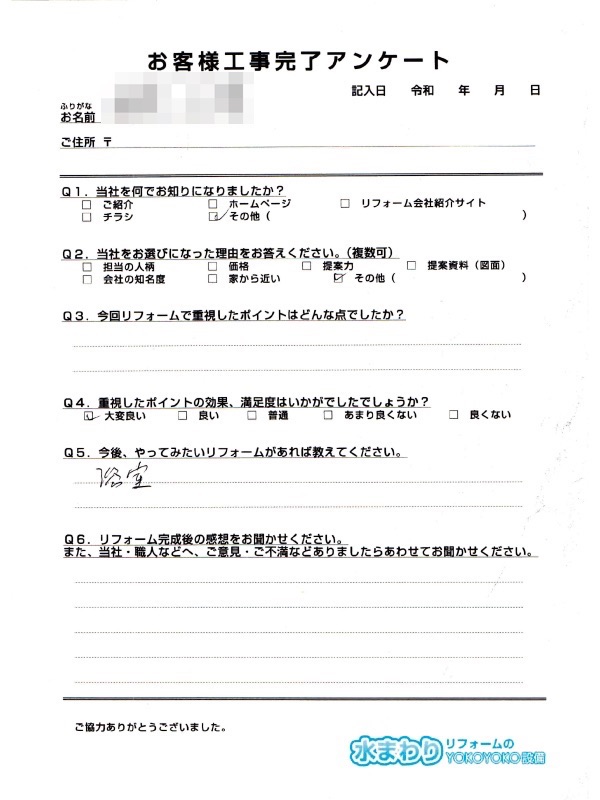 お客様に満足していただける住まい作りができるよう、また、私たちが今後もより良いお手伝いができるよう、工事完了後にアンケートをご記入いただいています。