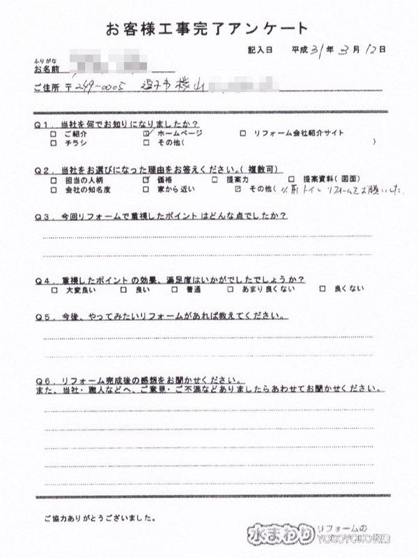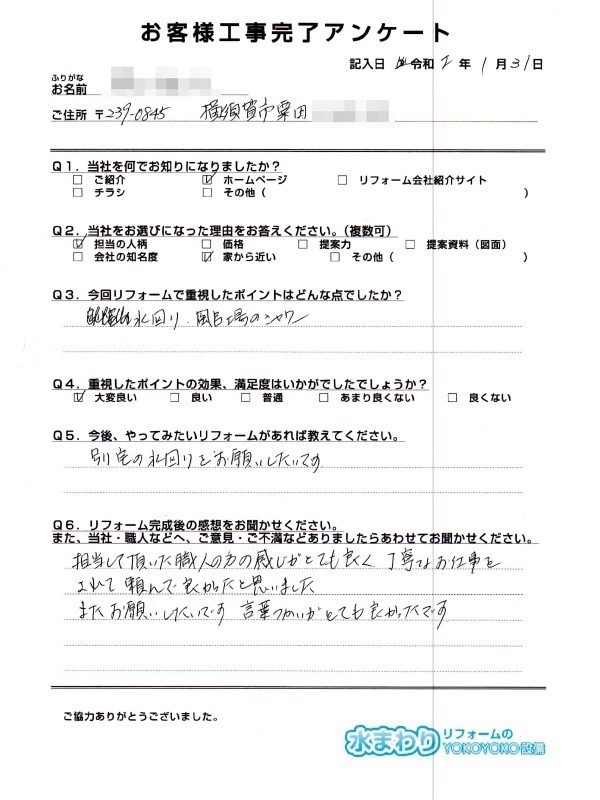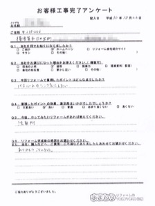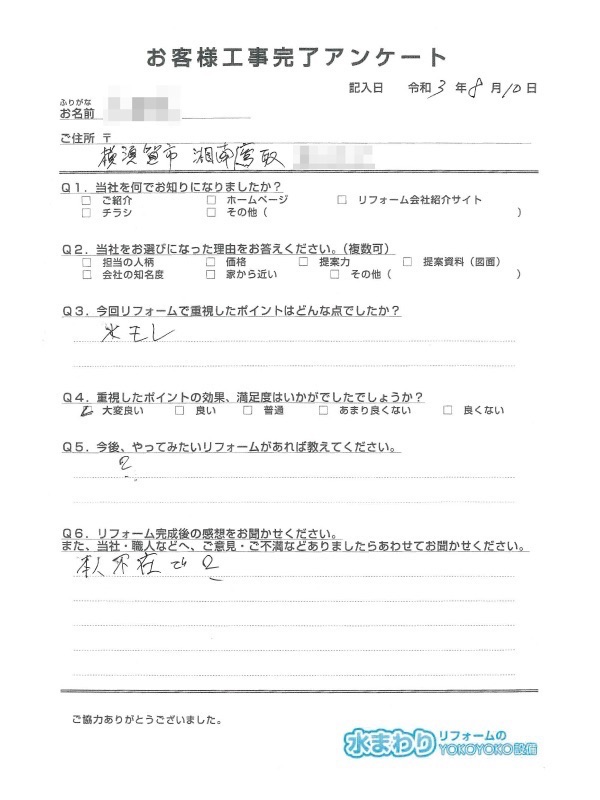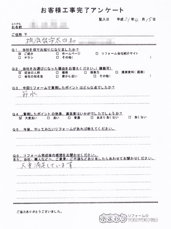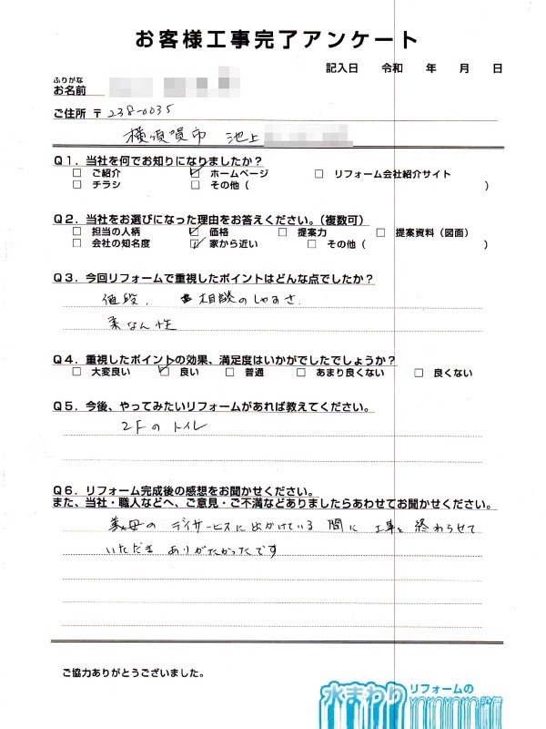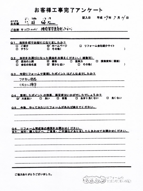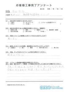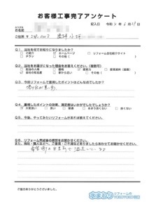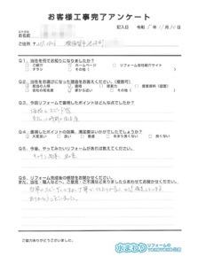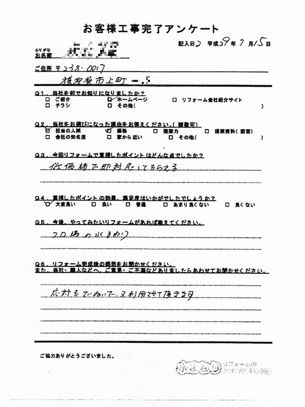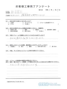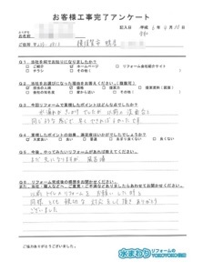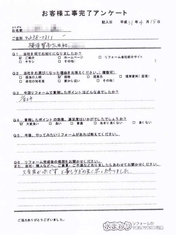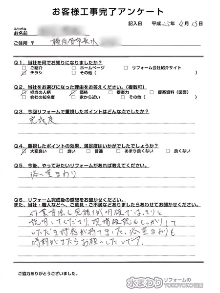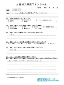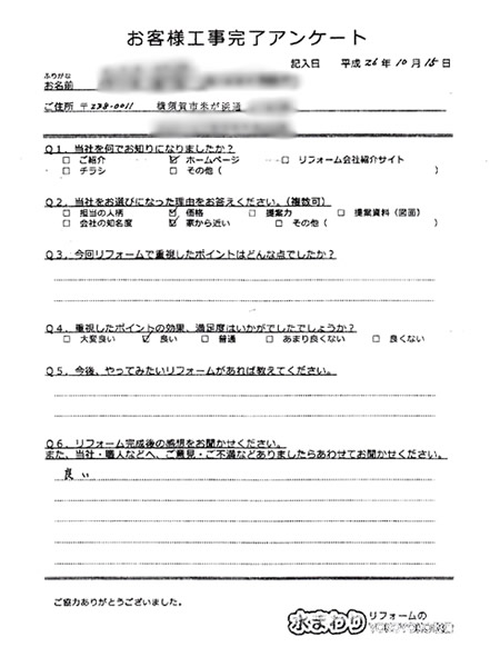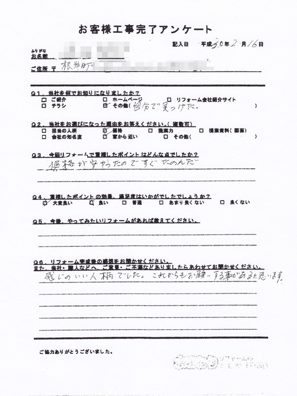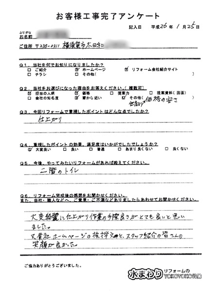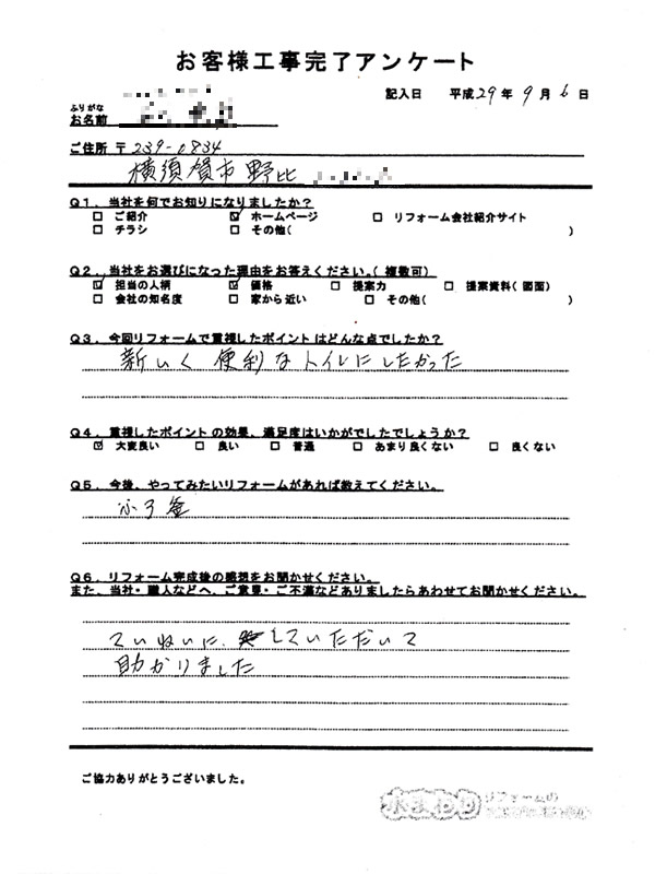 お客様に満足していただける住まい作りができるよう、また、私たちが今後もより良いお手伝いができるよう、工事完了後にアンケートをご記入いただいています。
