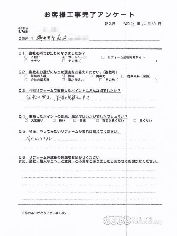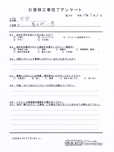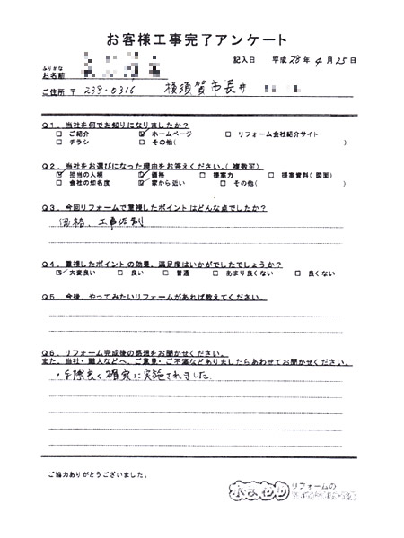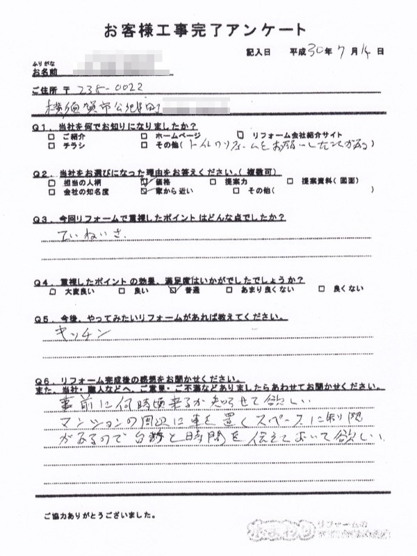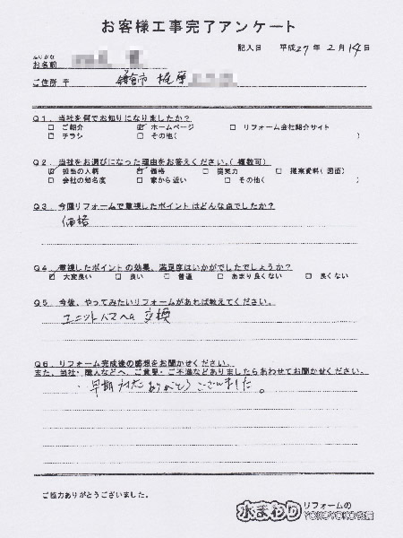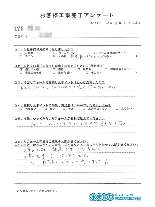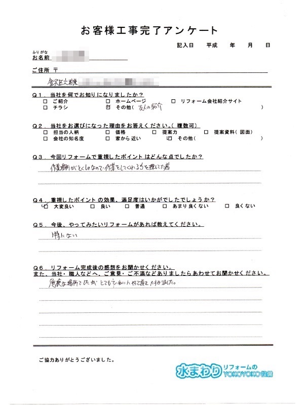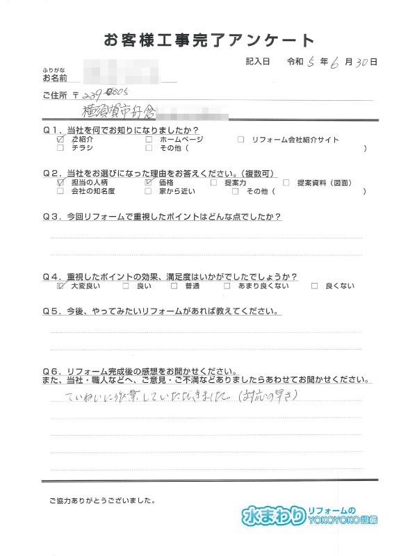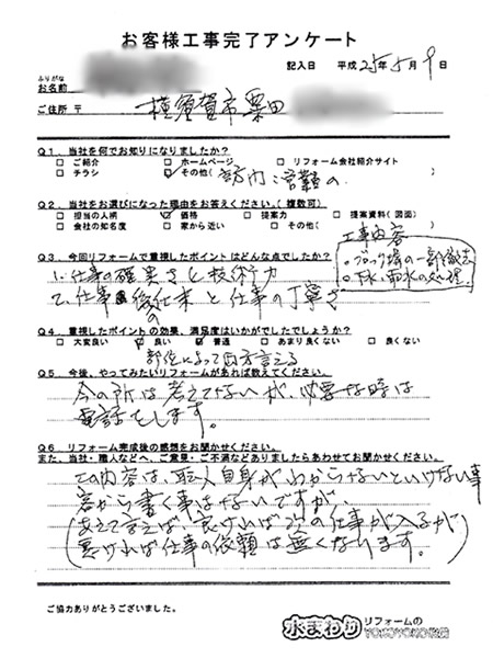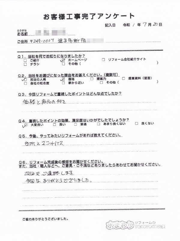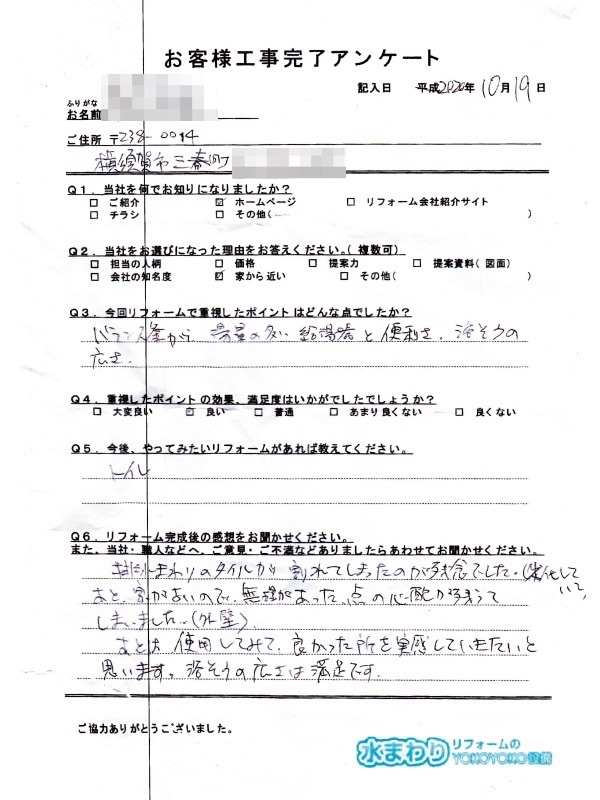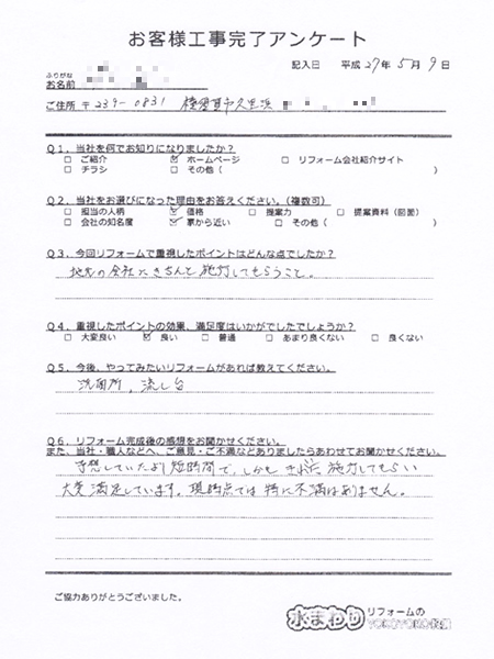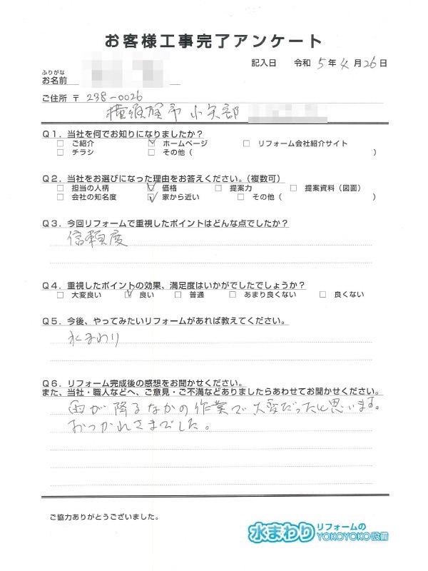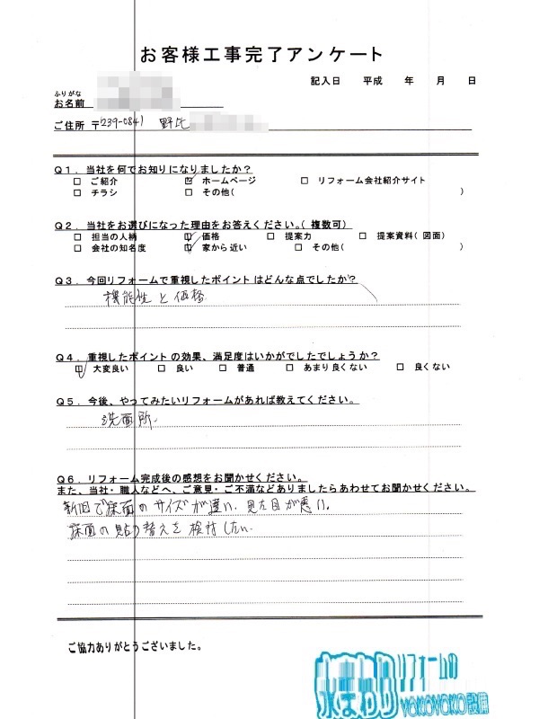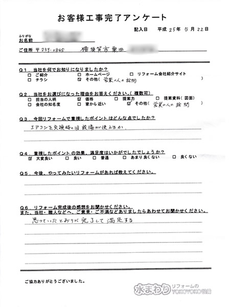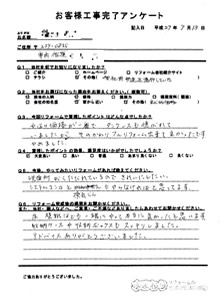 お客様に満足していただける住まい作りができるよう、また、私たちが今後もより良いお手伝いができるよう、工事完了後にアンケートをご記入いただいています。