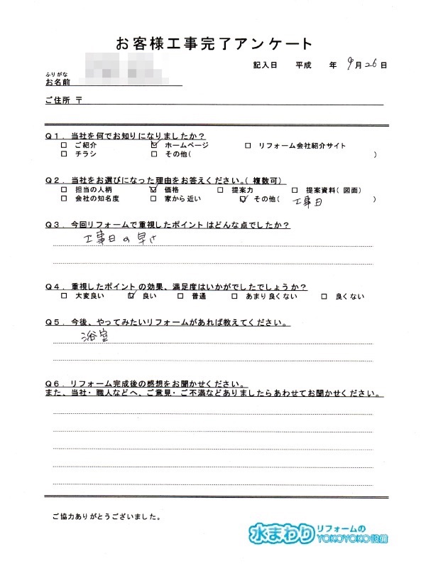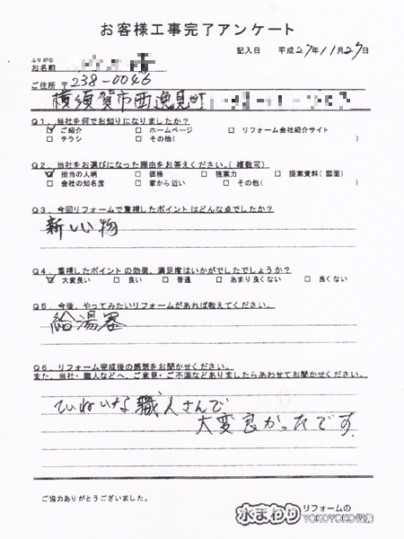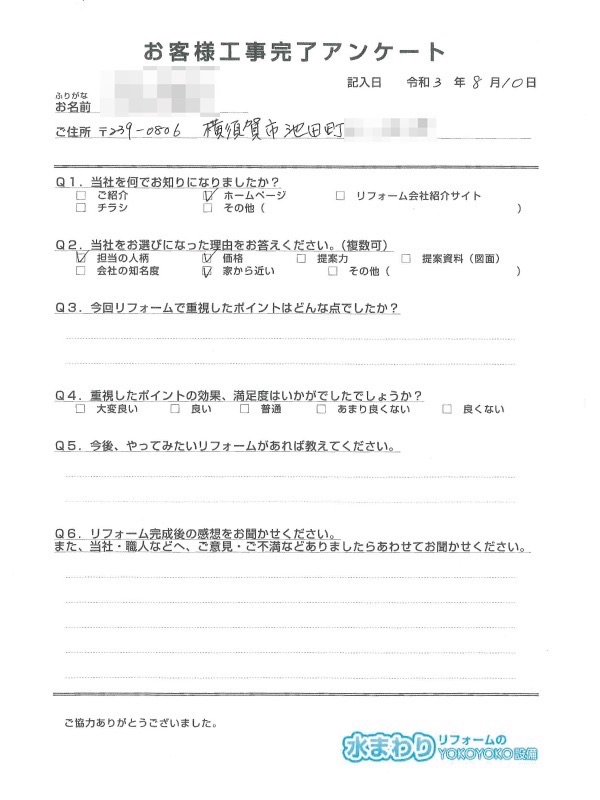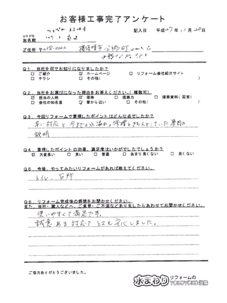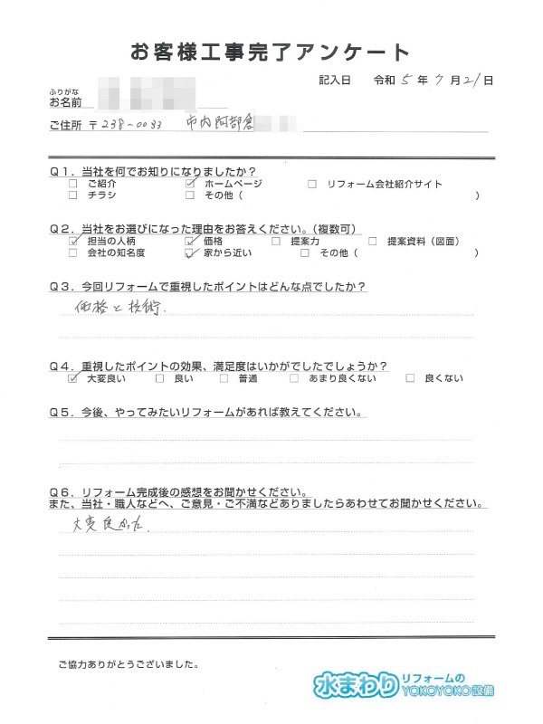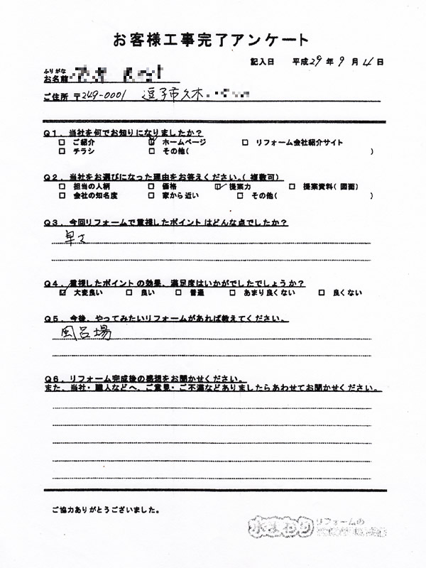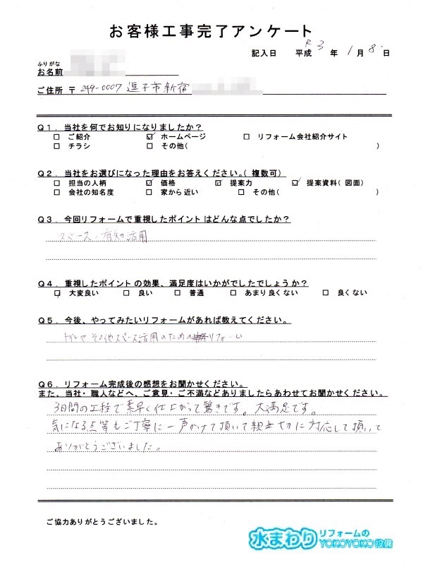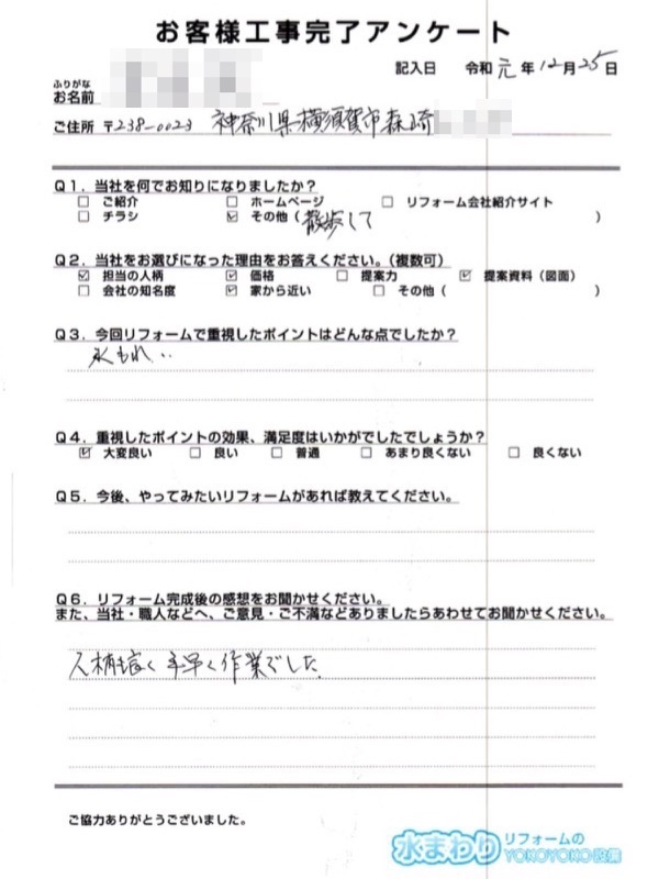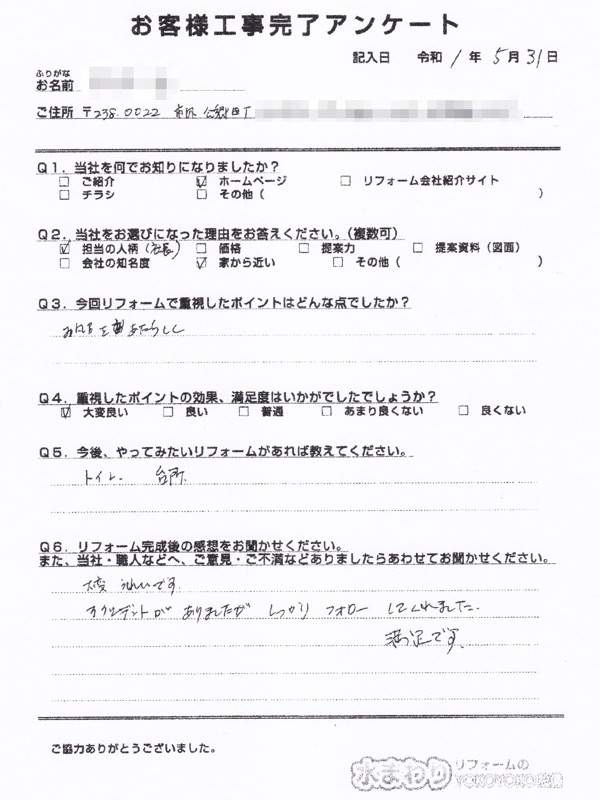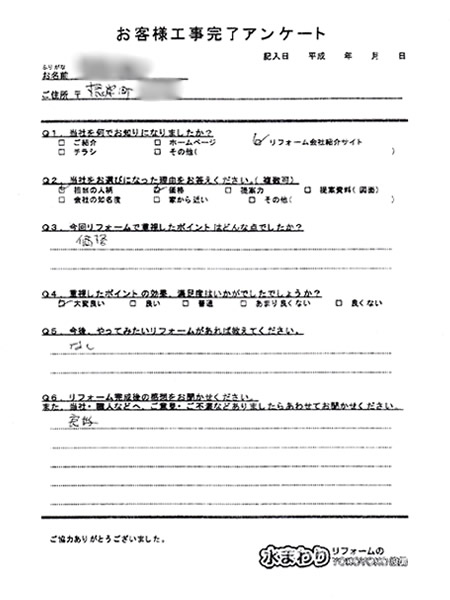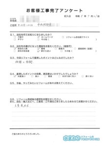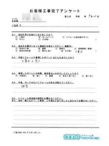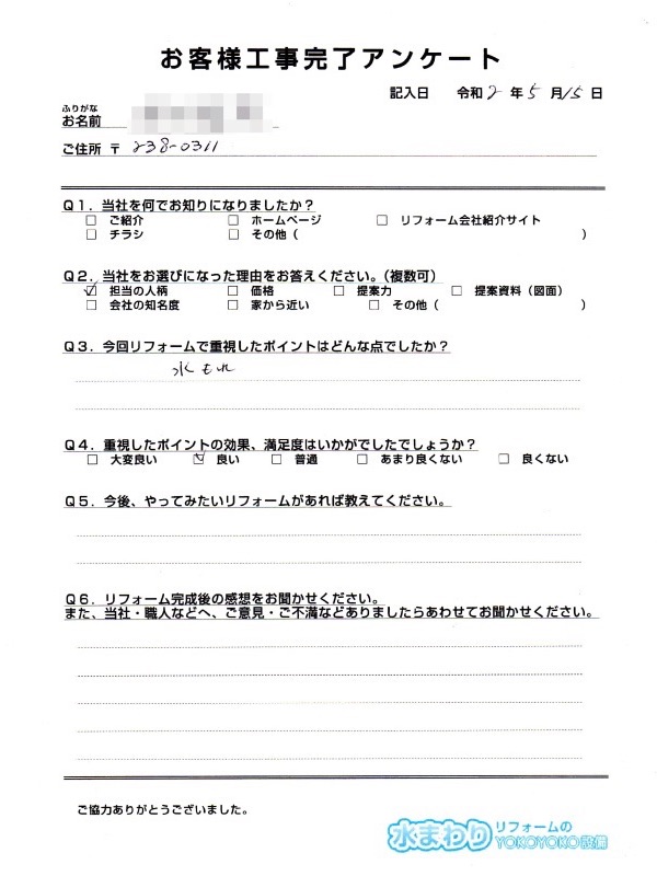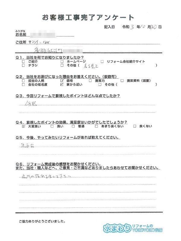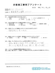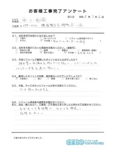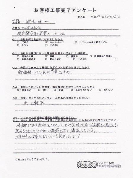 お客様に満足していただける住まい作りができるよう、また、私たちが今後もより良いお手伝いができるよう、工事完了後にアンケートをご記入いただいています。
