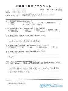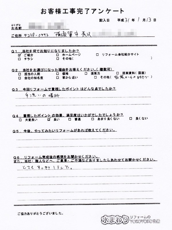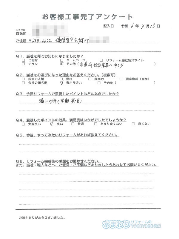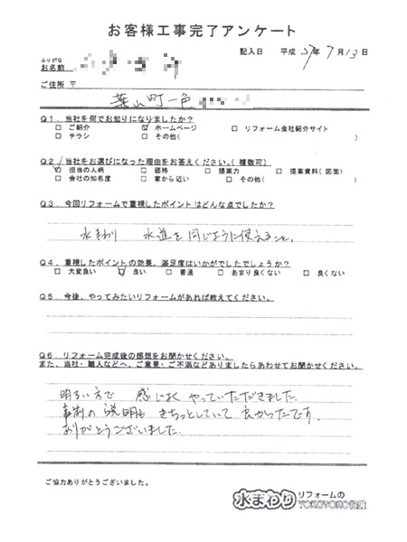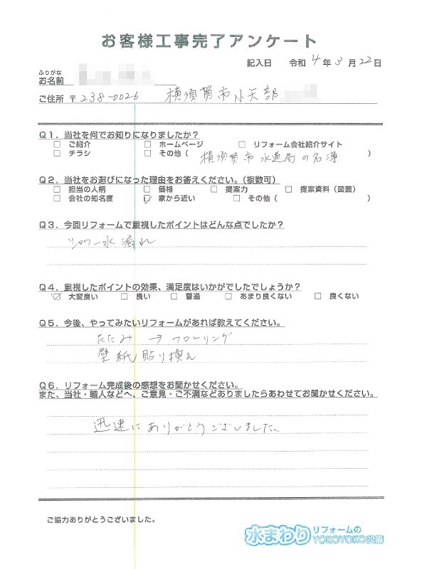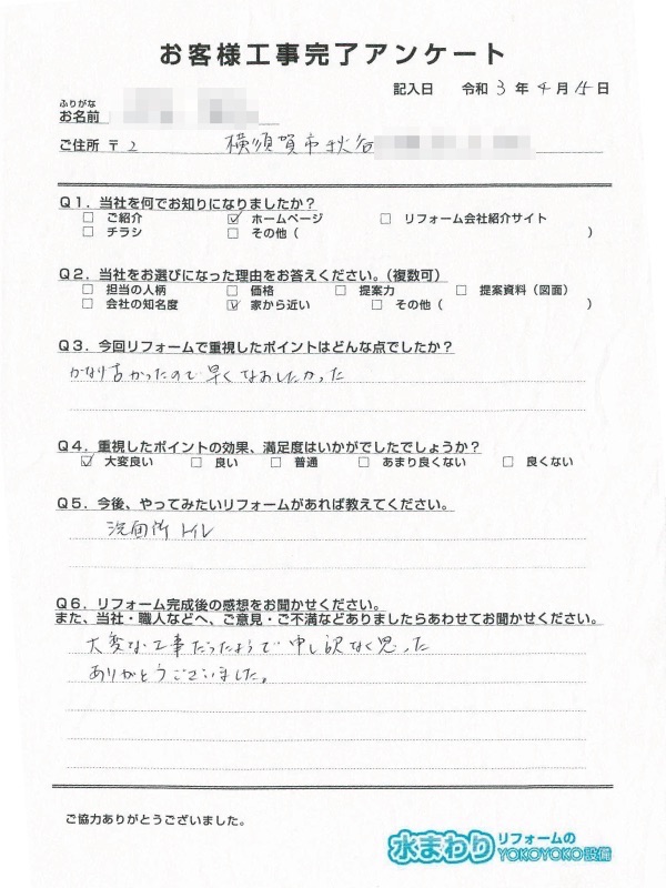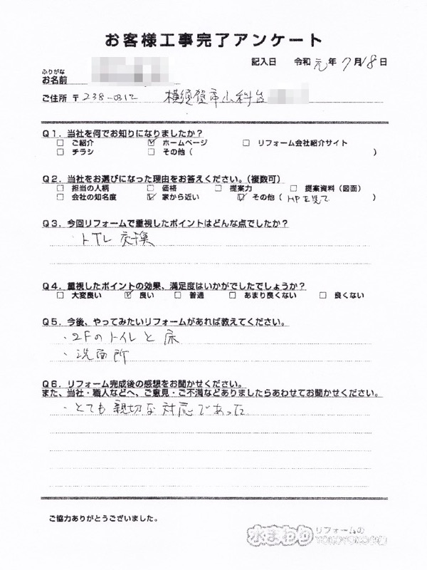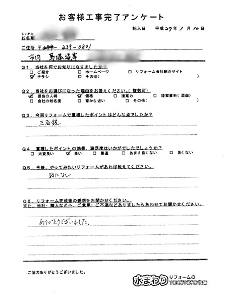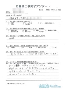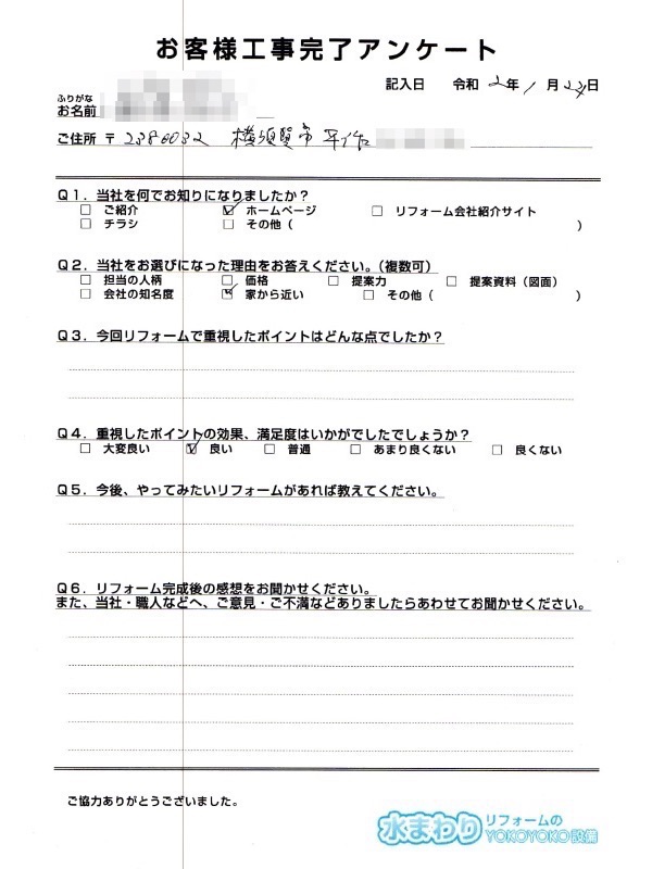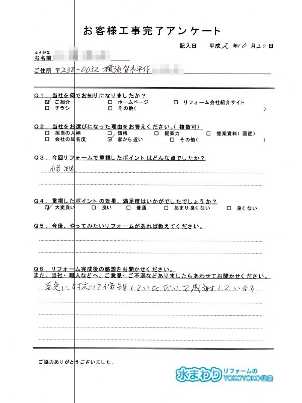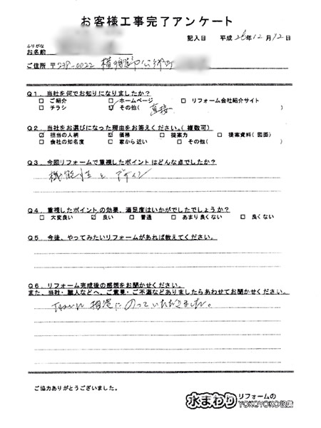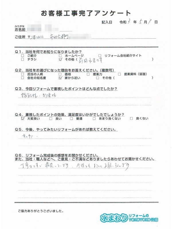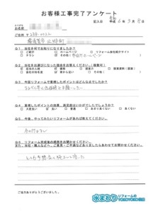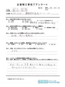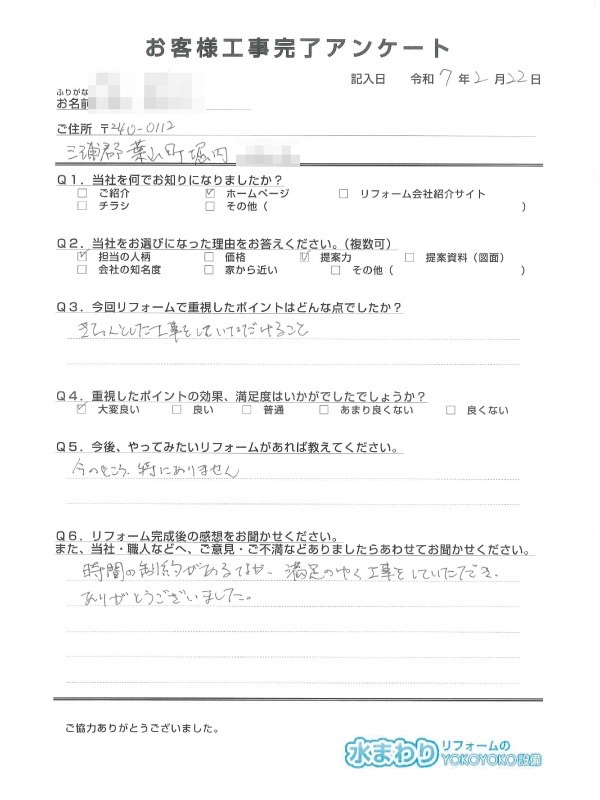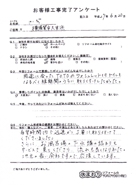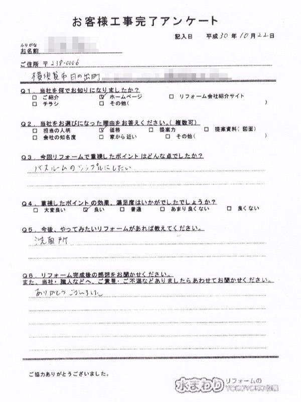 お客様に満足していただける住まい作りができるよう、また、私たちが今後もより良いお手伝いができるよう、工事完了後にアンケートをご記入いただいています。
