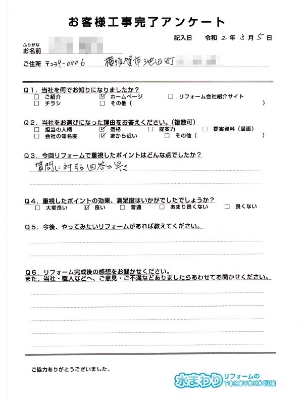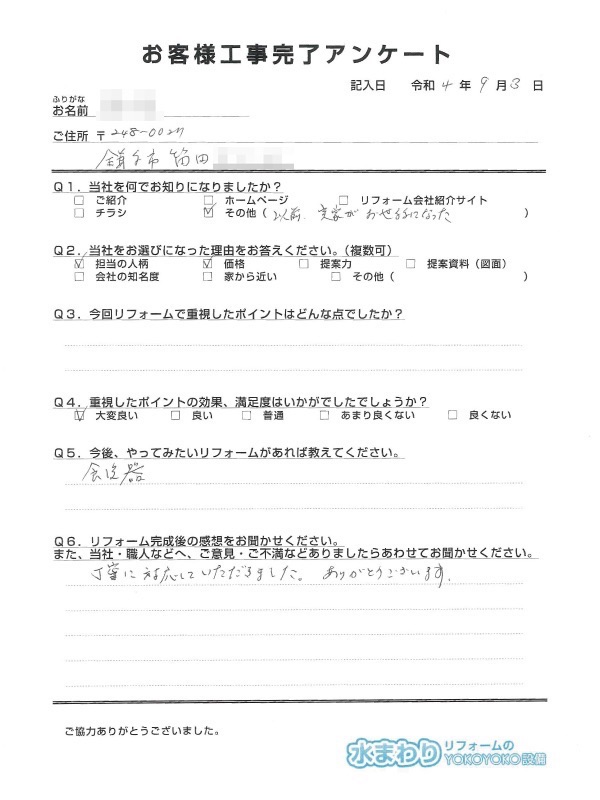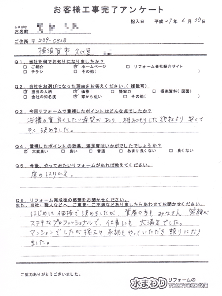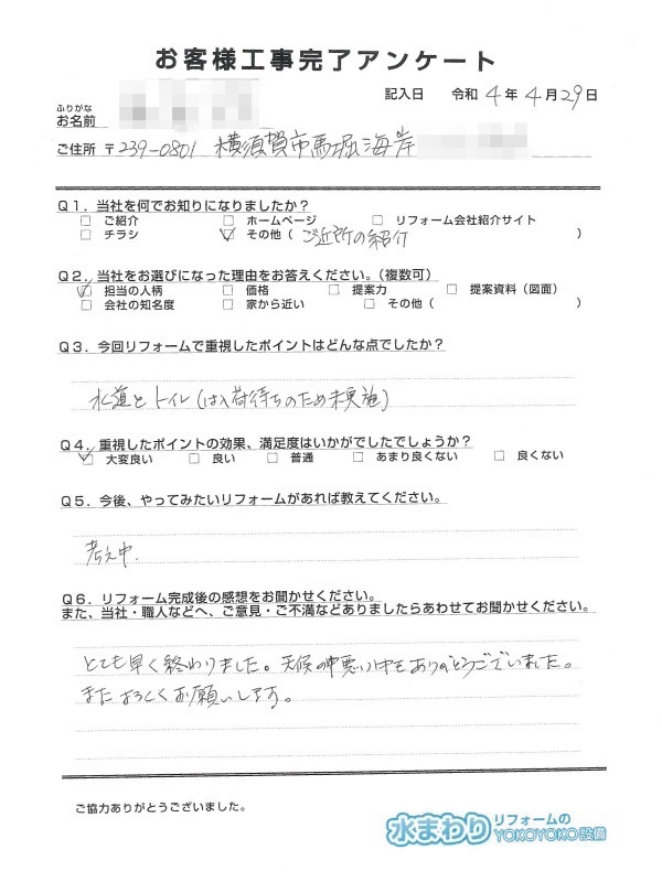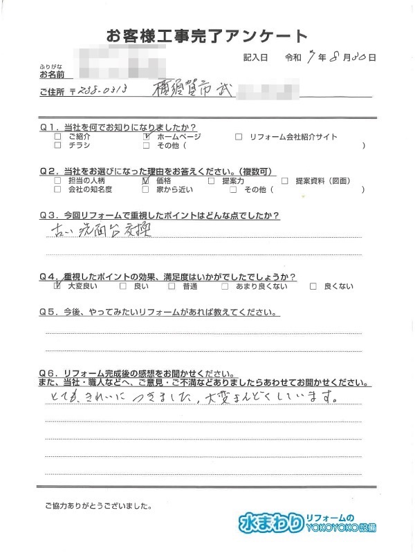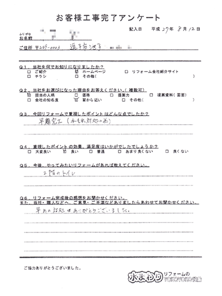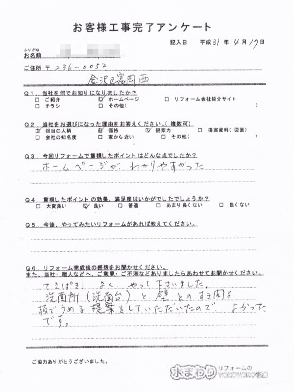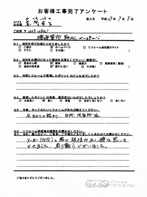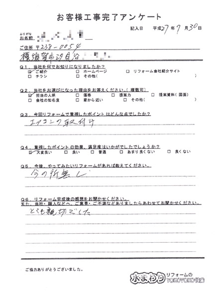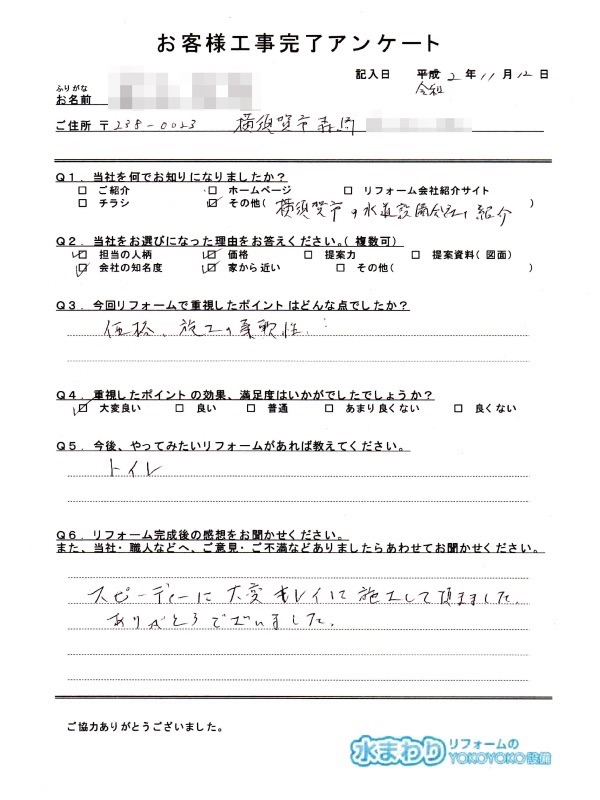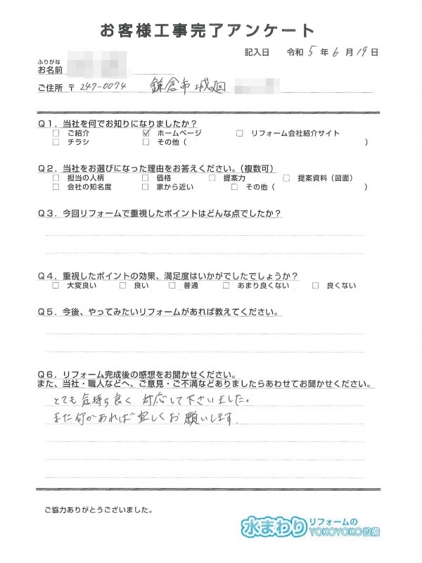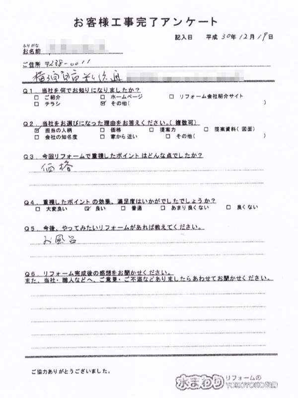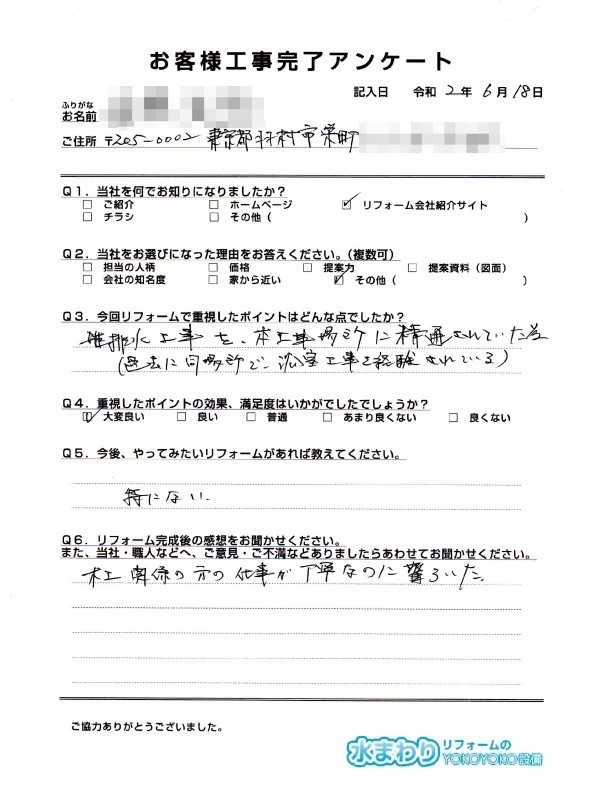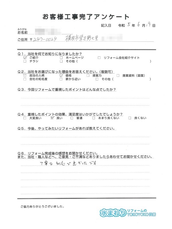お客様に満足していただける住まい作りができるよう、また、私たちが今後もより良いお手伝いができるよう、工事完了後にアンケートをご記入いただいています。