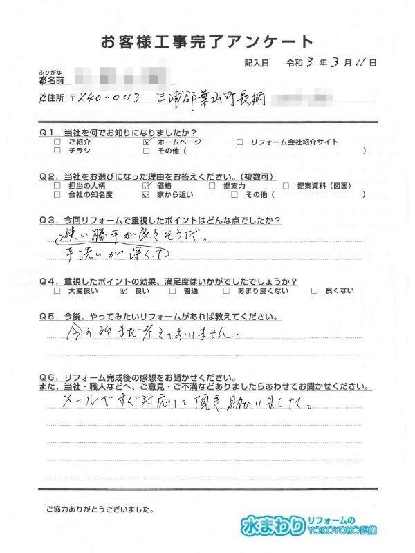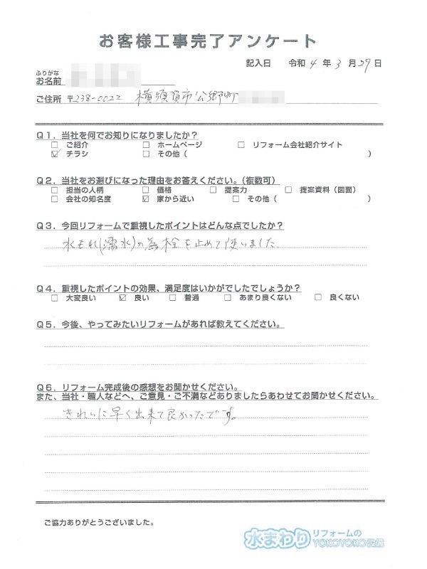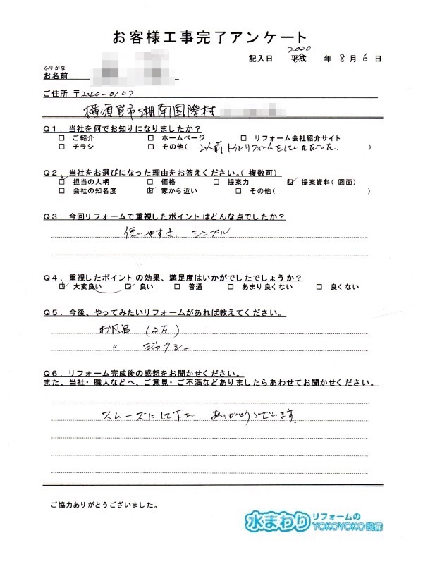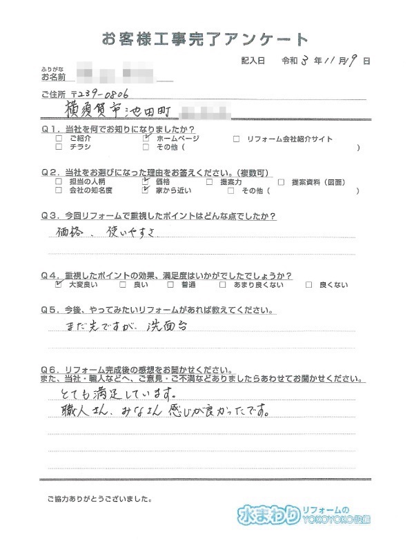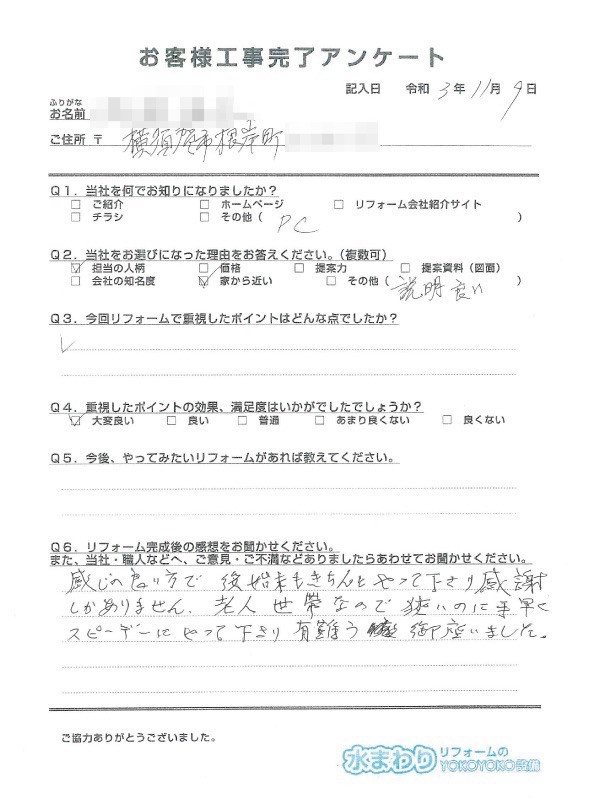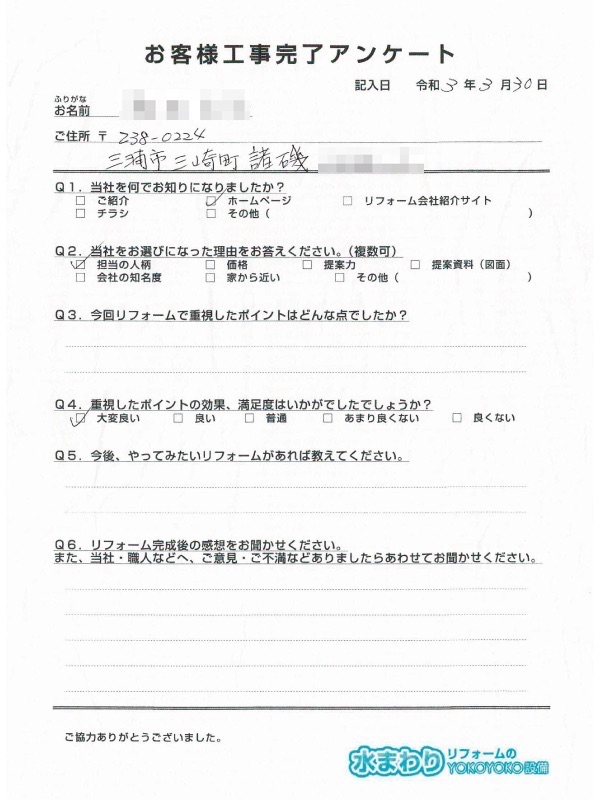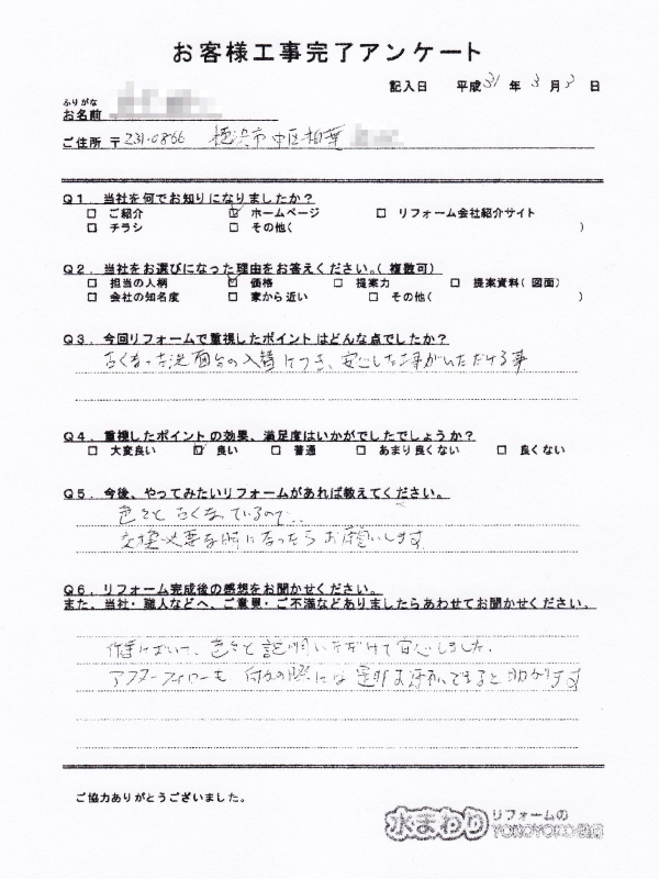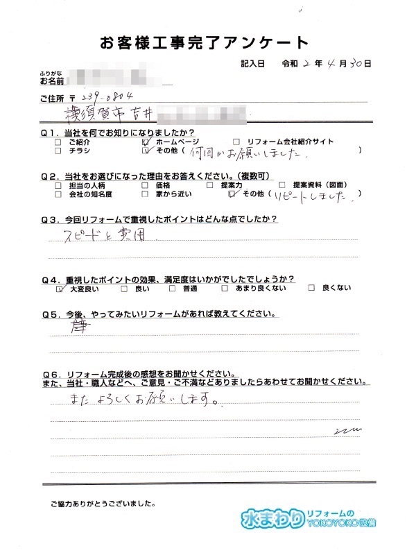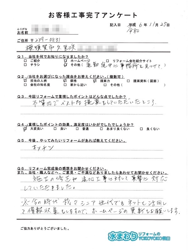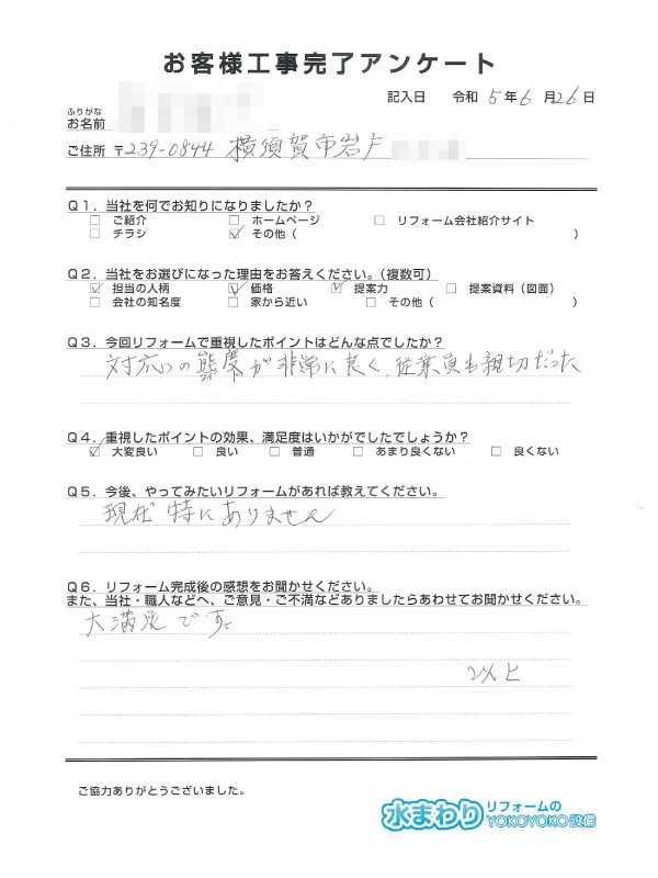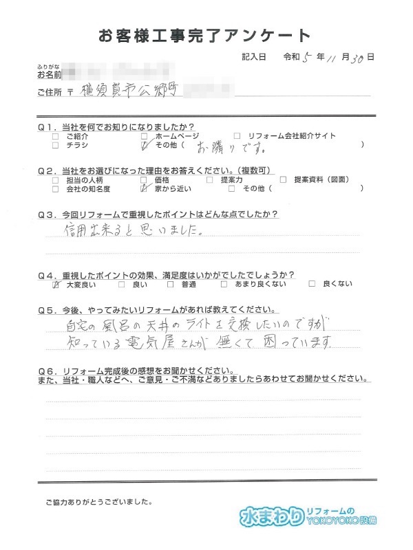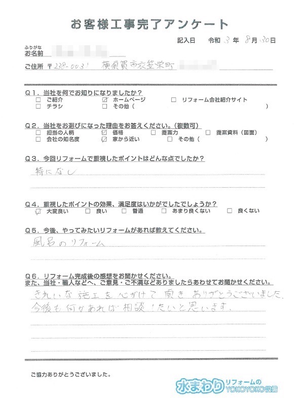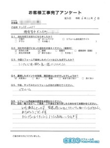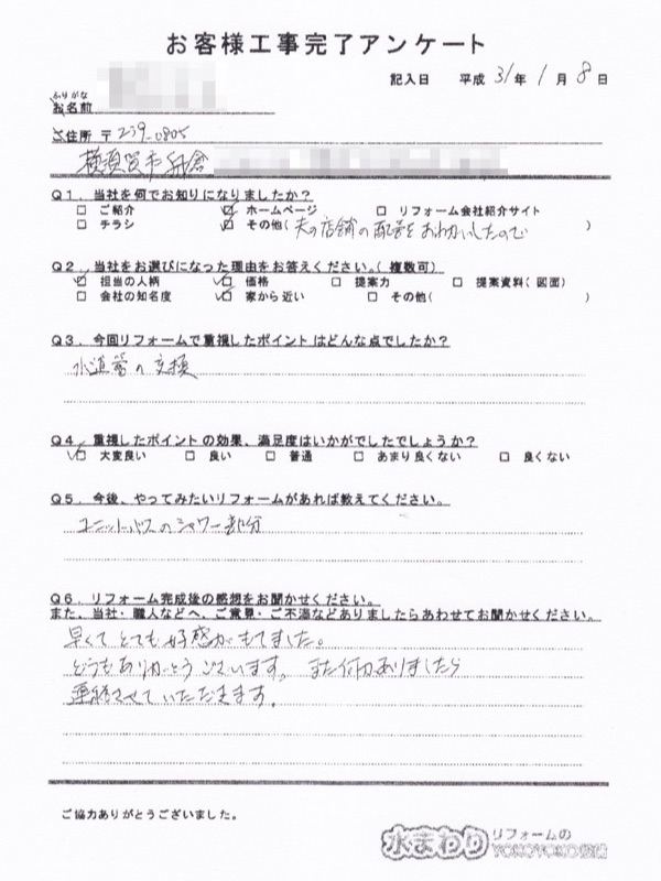 お客様に満足していただける住まい作りができるよう、また、私たちが今後もより良いお手伝いができるよう、工事完了後にアンケートをご記入いただいています。