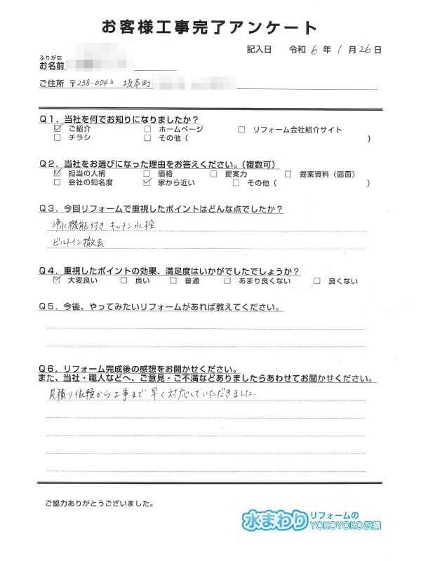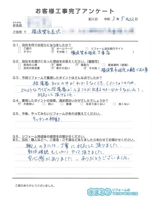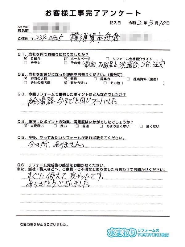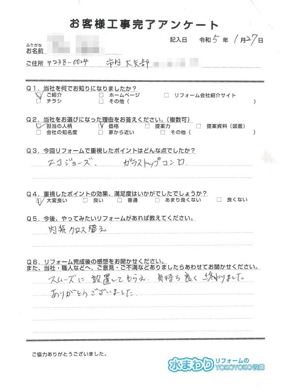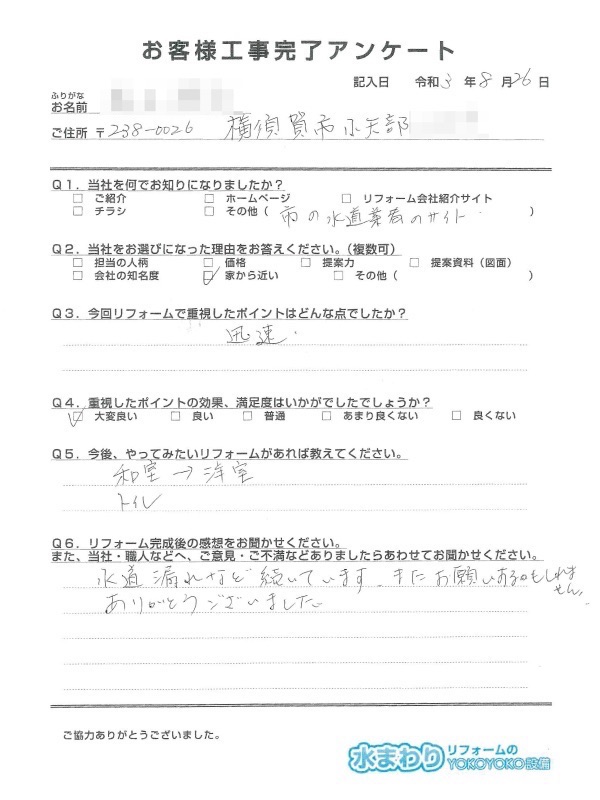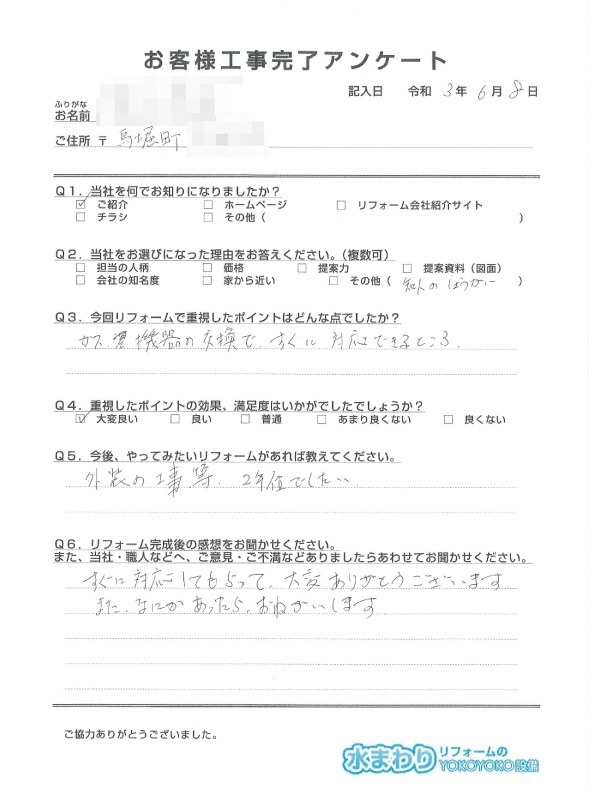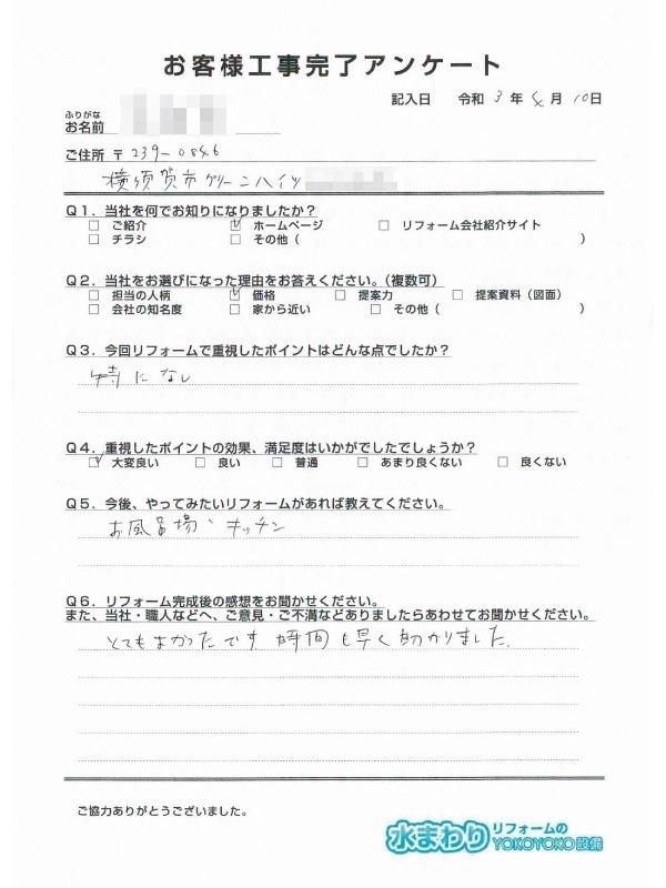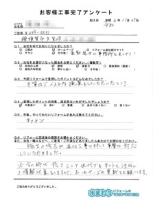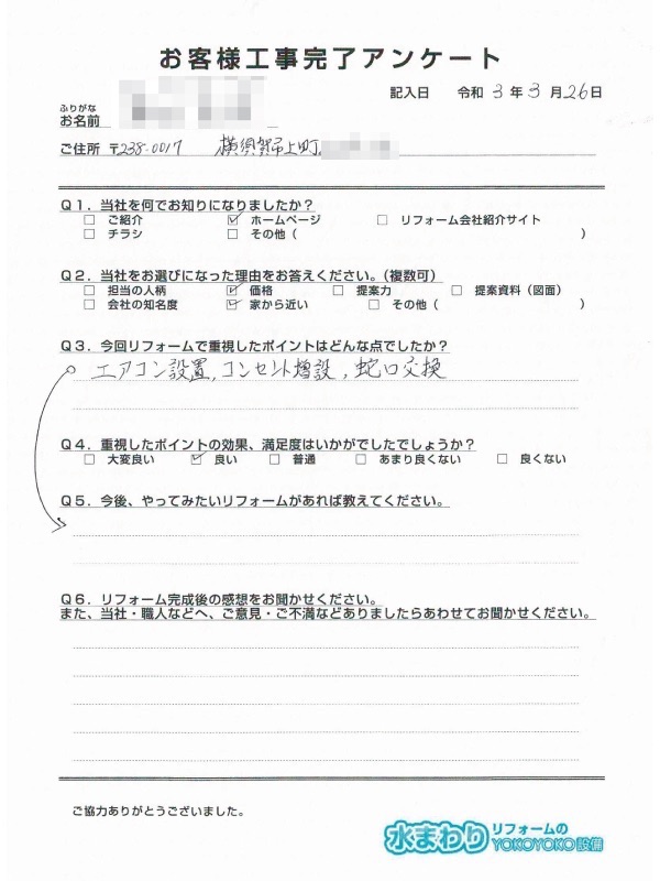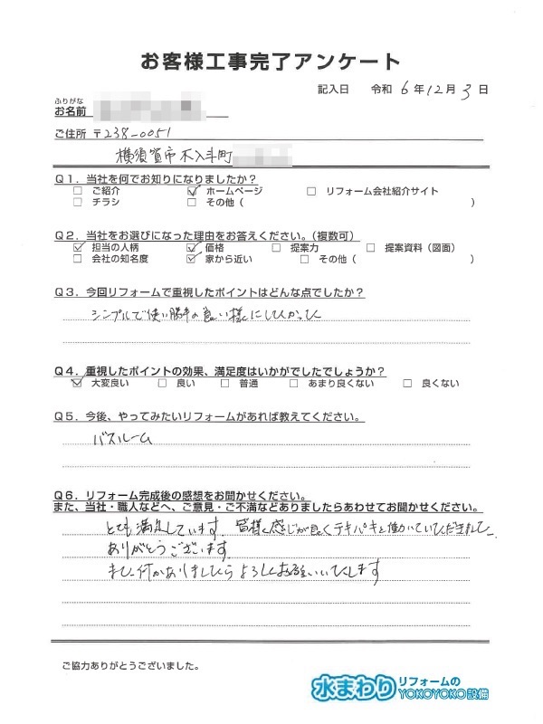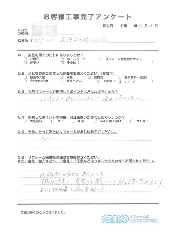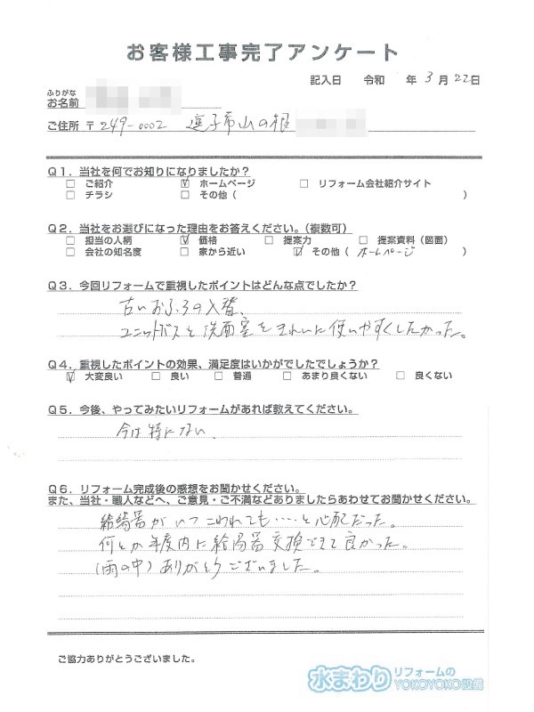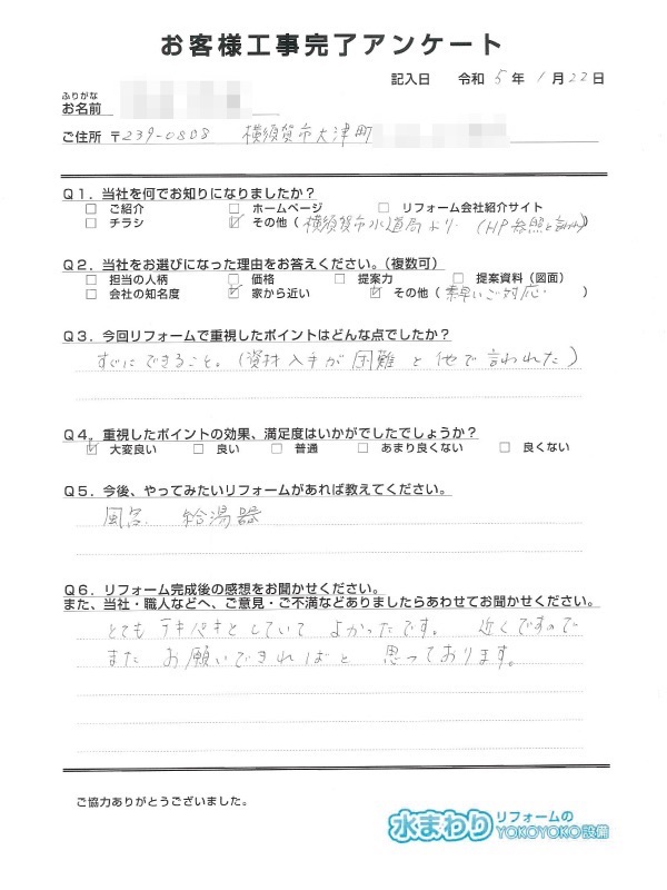 お客様に満足していただける住まい作りができるよう、また、私たちが今後もより良いお手伝いができるよう、工事完了後にアンケートをご記入いただいています。