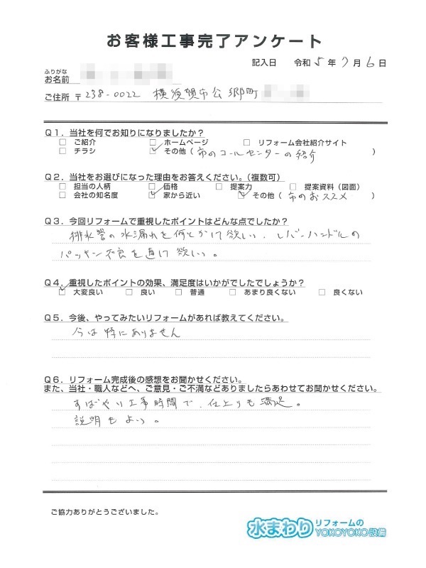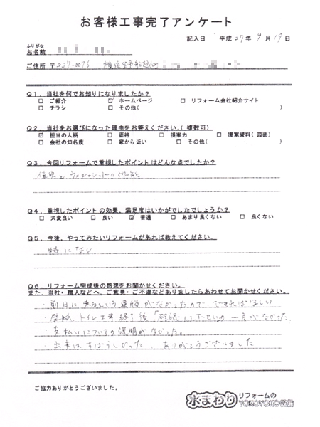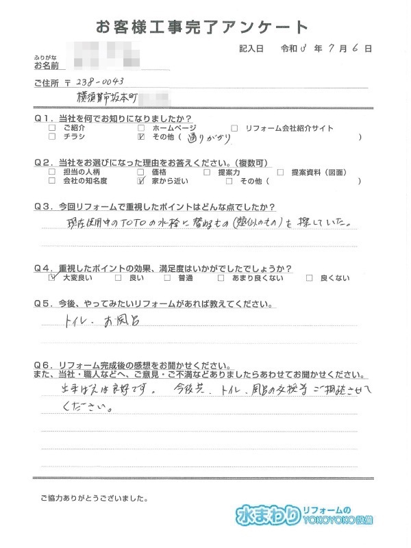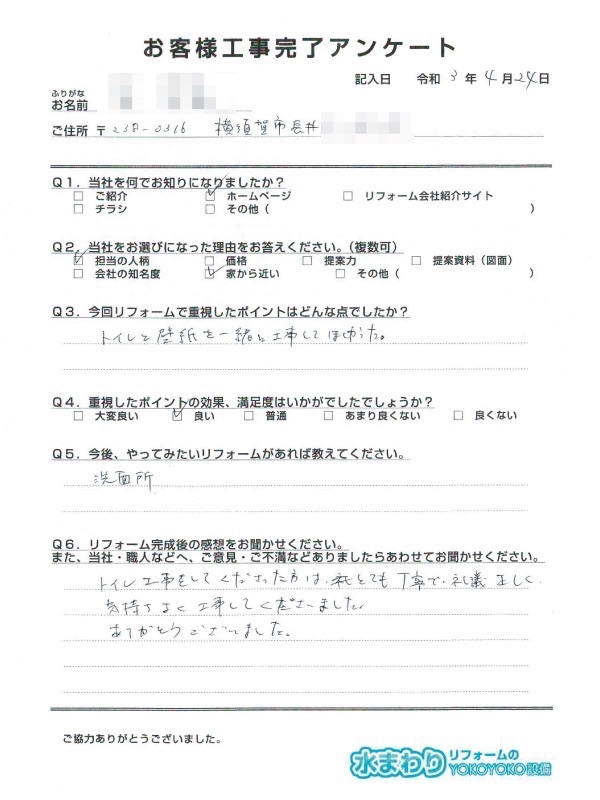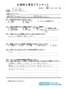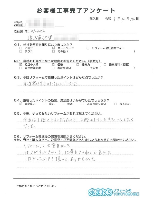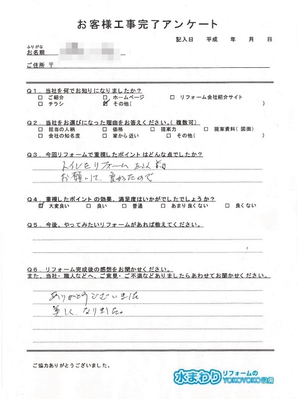 以前トイレのリフォームをお願いした時と同様、とても親切な対応をして頂きありがとうございました