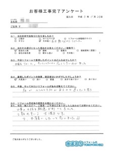 作業方法と見積りが明確ではっきりと説明してくださり、現場確認もしっかりしていただき好感が持てました。浴室まわりも時期が来たらお願いしたいです。